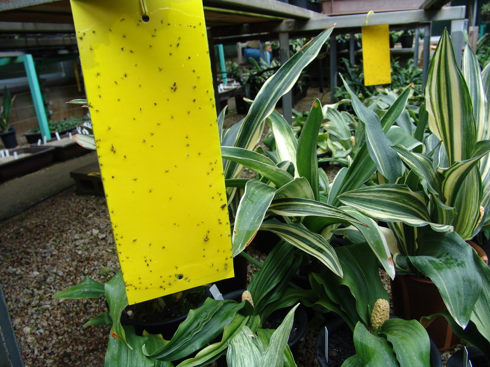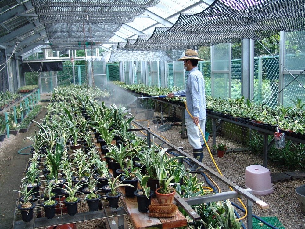 設置の状態  竹酢液と併用して行うと虫の付着数がすくなくなります。おもとの病気の予防(虫が媒体)  竹酢液使用方法
