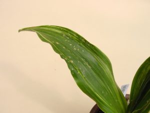 おもとでは、スリップスは温かいと2月終わりぐらいから活動しだす1ミリ以下の事も多く、小さいのでなかなか見つからない新芽の柔らかい部分を好み、葉が出てくる前に植物の細胞の内容物を吸い取り、観賞価値を落としてしまう。