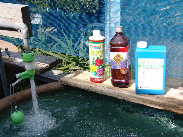 液肥のスーパー1 万年青の豊明園のある愛知県岡崎市では、5月から30℃を超え、肥料が怖くなる時があります。そのため、5月以降は1万倍前後にして天気の良い日に適宜 液肥のスーパー1を上げています。