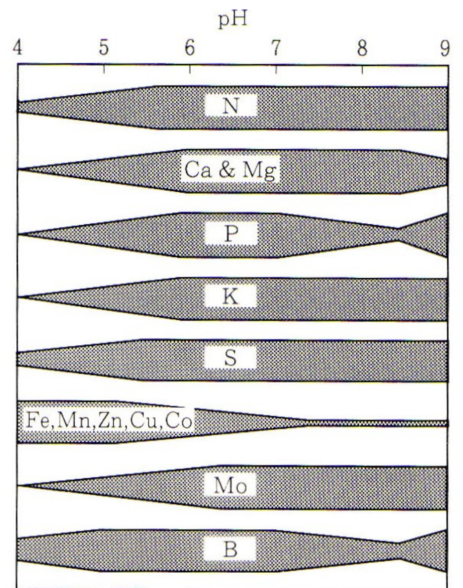 これは、1970年にBacmanさんたちが調べた、植物の栄養とpHの関係です。