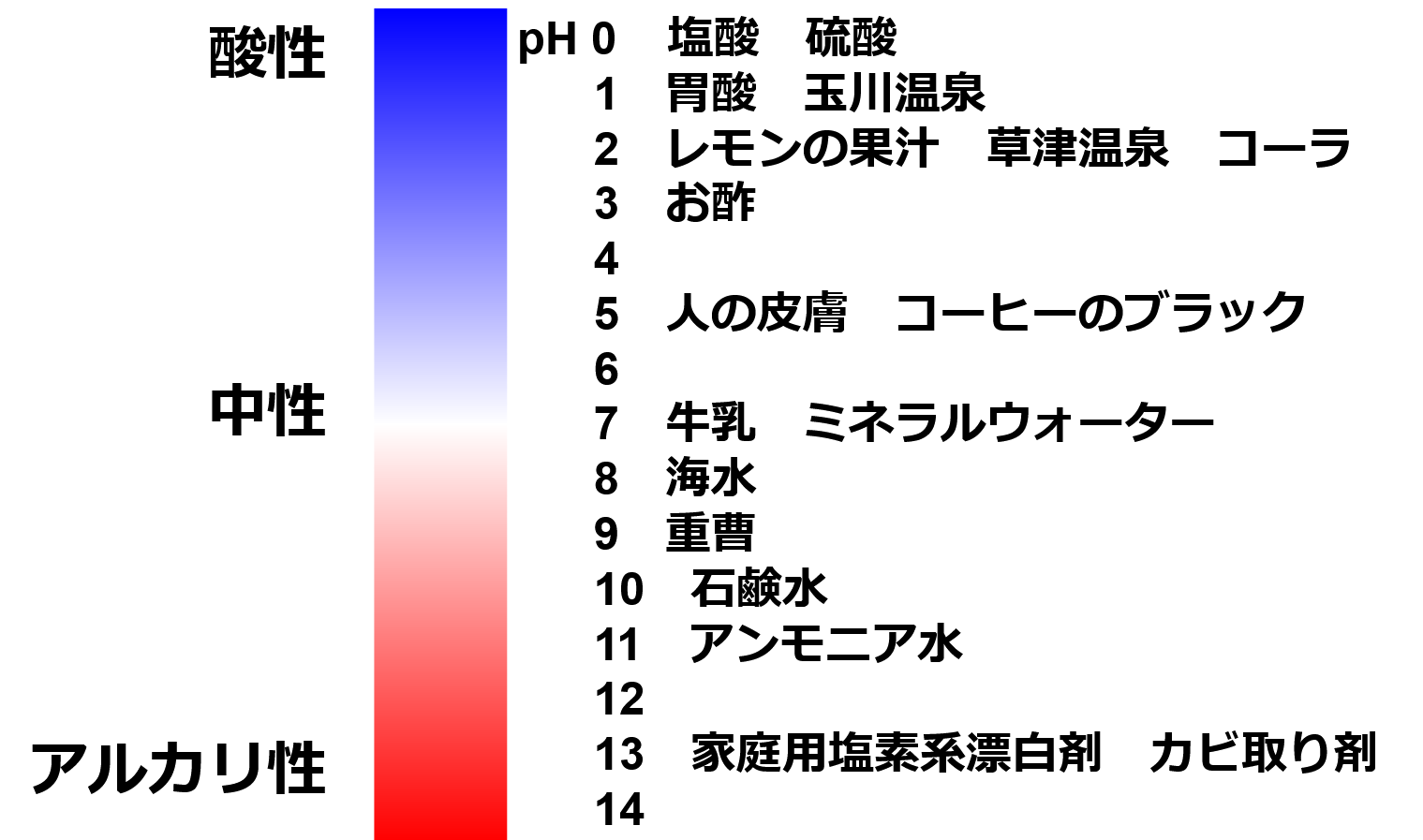 pH7は中性で、数字が小さくなると酸性になります。例えば、(コーヒーのブラックはpH5の弱酸性)、お酢はpH3,レモンの果汁はpH2、胃の中の胃酸や劇物の硫酸、塩酸はpH1になります。(酸性温泉で有名な草津温泉pH2や玉川温泉はpH1.2になります。)