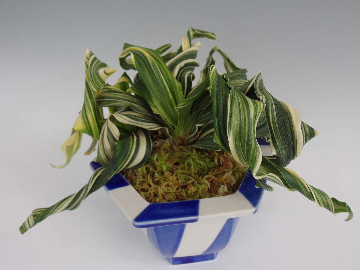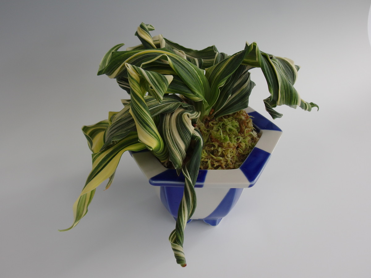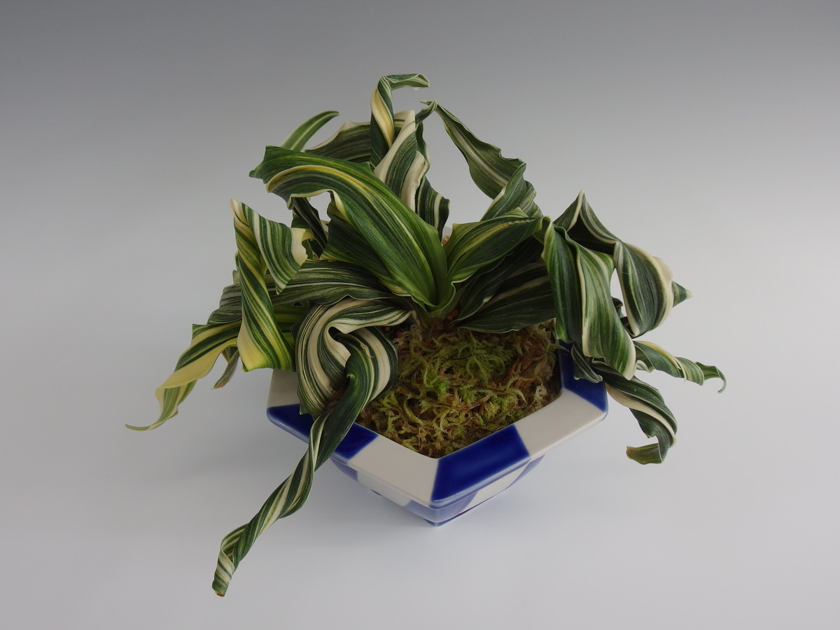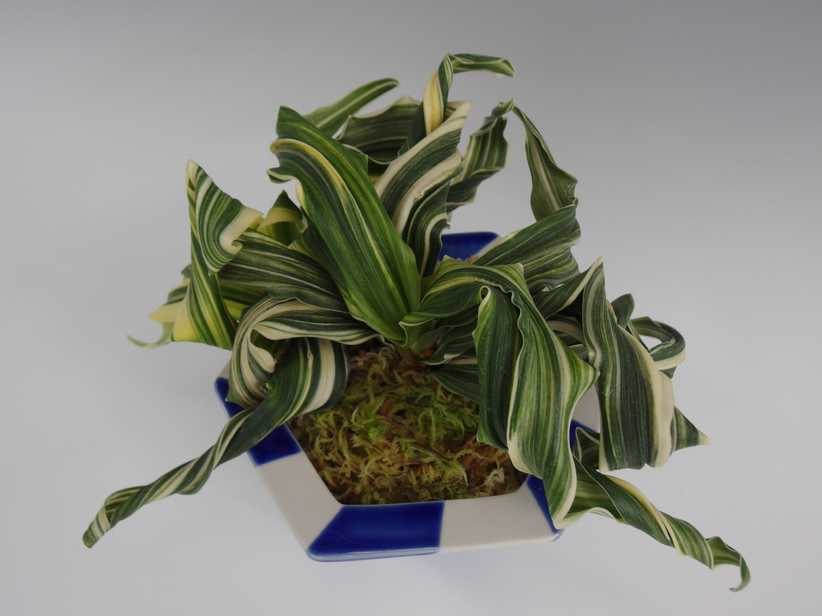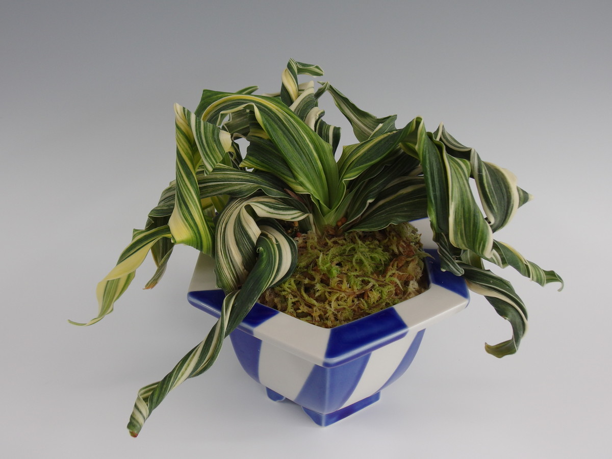 その四君子を作出した園が、この【仙寿の舞】を作出しました。青、縞、縞覆輪と様々に柄を楽しみ、粗い地合いを持ち、若いうちは高い甲竜を現し、成長するにつれ低い総雅糸竜を現す。巻き方は強く、折れ曲がるような‘角巻き’をみせて力強い。姿は乱さず、きめの細かい地合いは繊細で上品な容姿となり一見して判別がつく。