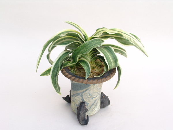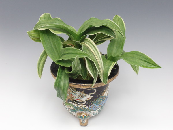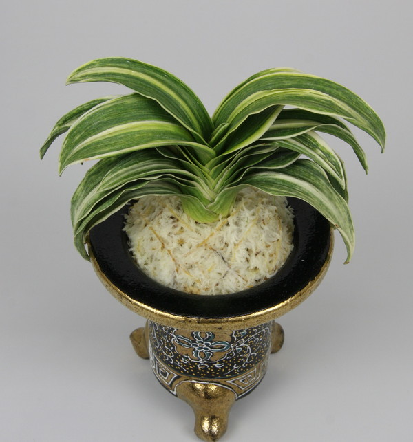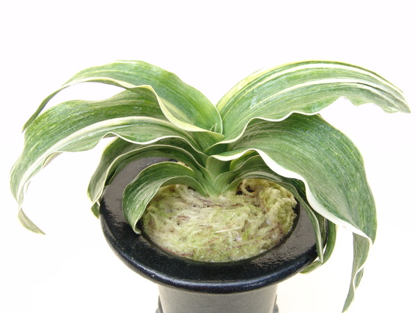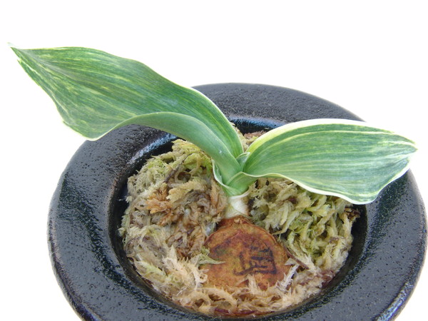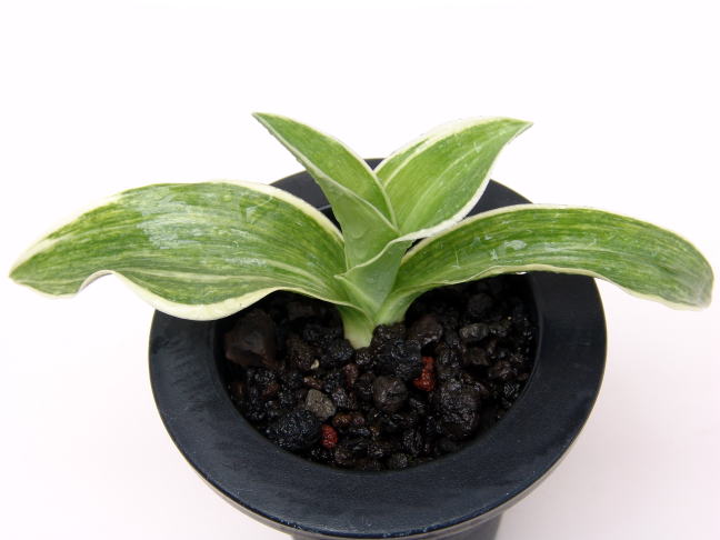 葉全体に胡麻斑を見せ、腰太く葉先は尖り、中ほどから折り下げる。黄白色の覆輪を見せる。葉繰りも良く子上も良い品種。採光は強めにして作る、肥料は普通。