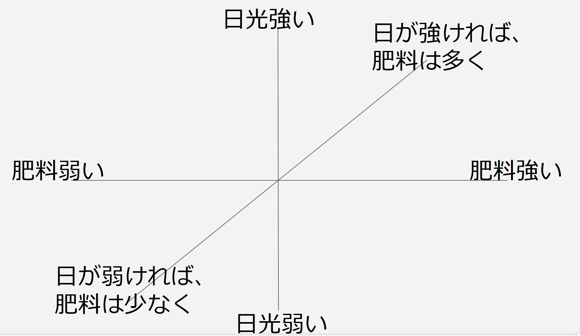 日光の強さ、肥料の強さで考えると、斜めの線のように、日光が強くなれば肥料も多くして、日光が弱ければ、肥料も少なくすればバランスの取れた肥料になるでしょう。