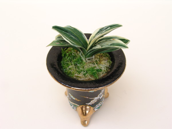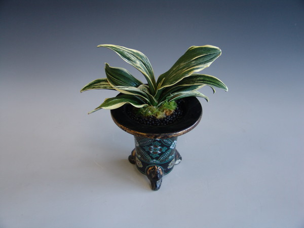 家康 (いえやす) 3.8号鉢 4年生 日陰作りの作品、葉幅4cm内外の広い葉に、元から先まで白覆輪を掛け、緻密な雅糸竜を葉いっぱいに現す威風堂々とした力強い姿。羅紗のなかでは少し大型、羽を広げた鷲のような勇壮さがある。地合いは柚子肌で、性質は強健、採光、肥料ともに強くて良い。繁殖は芋吹きが主で、未だに数が少なく、棚入れに希望者も多い。