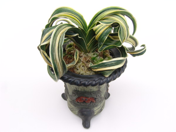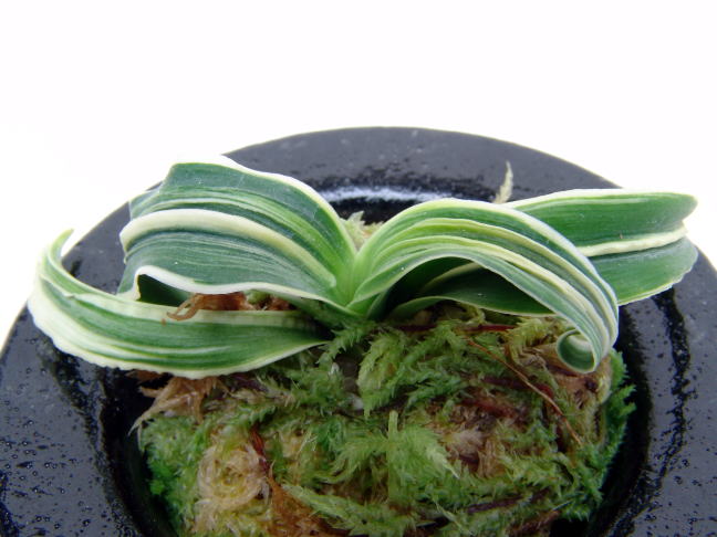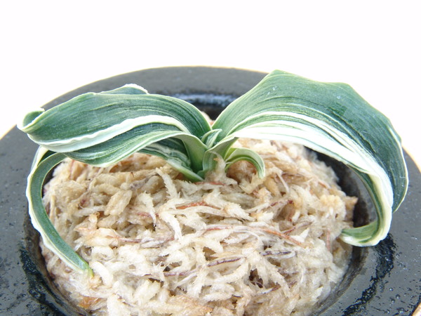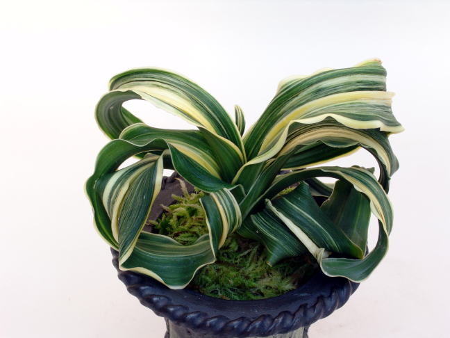 五万石 (ごまんごく) 鉢3.5号 3年生 葉はゆったりと丸く巻く。こちらも縞覆輪の美しい木。優雅なゆったりとした巻きに、絹雅糸竜という絹の様な細かな雅糸竜を現す稀品。荒々しい芸も素晴らしいが、五万石のような細かく、繊細な芸もよい。芸のよい、玉姫、夫婦獅子、海竜獅子などの品種と比べると数が圧倒的に少なく(10分の1か?)、貴重。