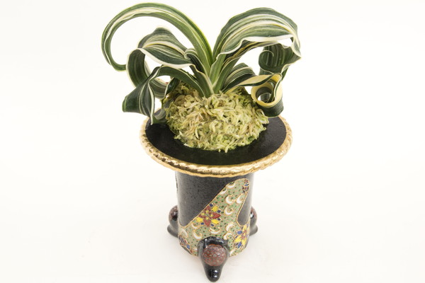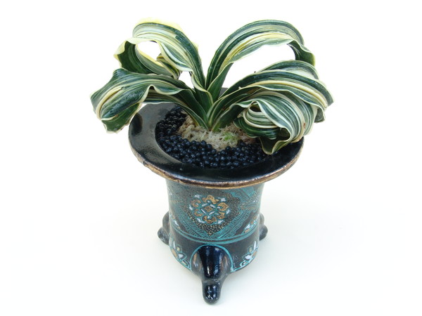 獅子系中型種、巻き方はゆったりと丸く巻く。地合いはきめが細かく艶があります。葉芸は甲竜の他に玉竜、剣葉を現し、特徴は絹雅糸と呼ばれる、葉全面に覆う繊細な雅糸竜の美しさを見せます。芸が激しく縞甲竜タイプの獅子といえるが、姿がまとまっていて愛くるしい。白い覆輪が深く、総雅糸竜が葉全面を覆うので華やかなイメージが強く、識別しやすい獅子。繁殖は芋吹きで殖やします。日光は中、肥料は少なめにします。