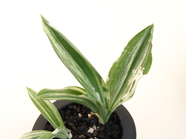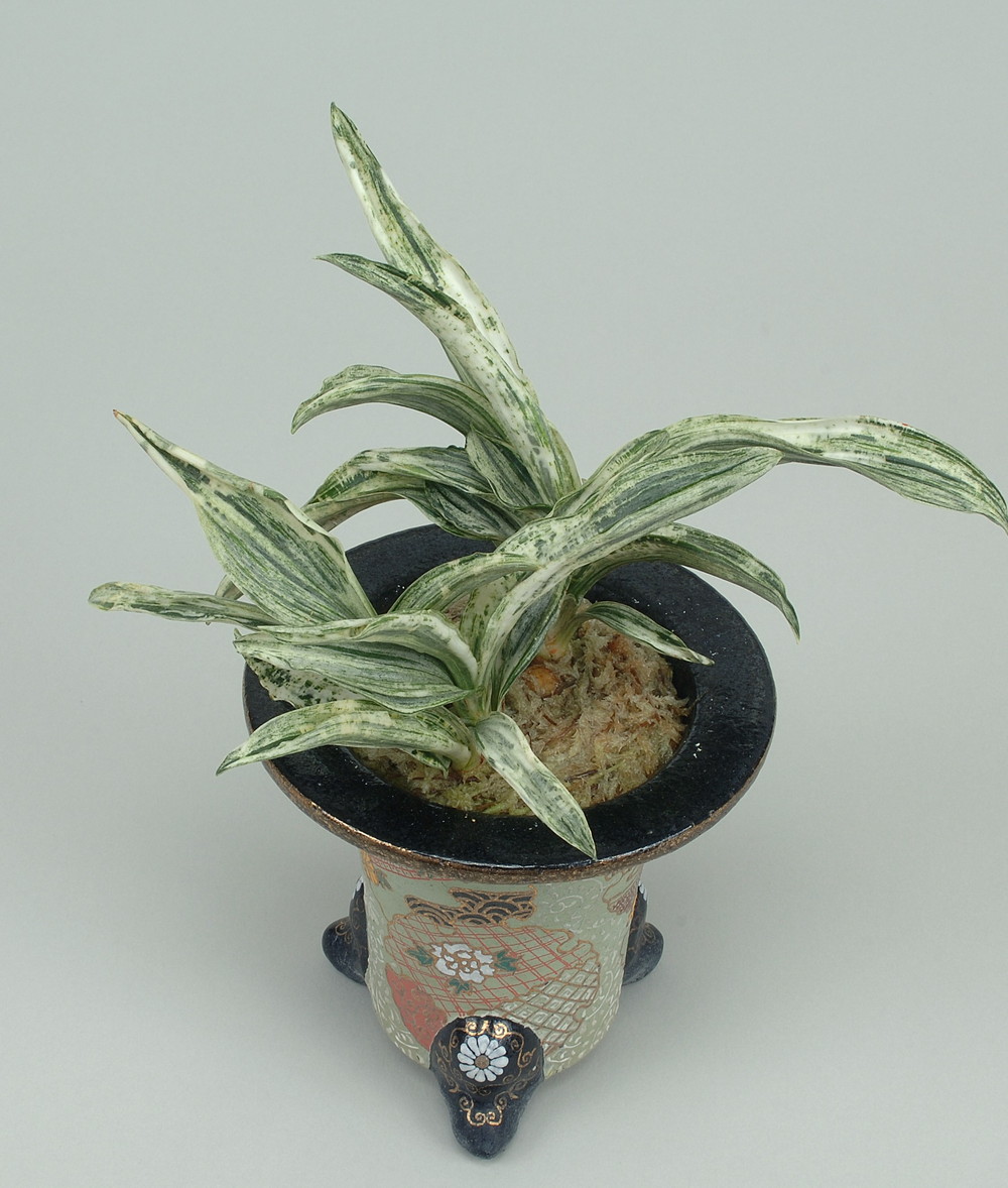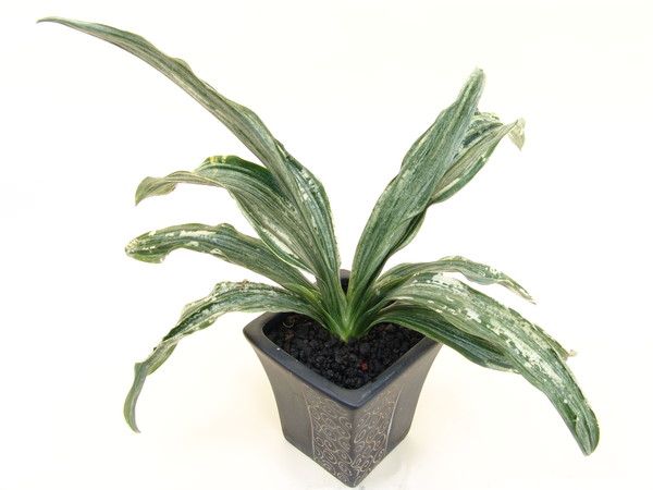 根岸斑の葉に白斑を見せ甲竜と図現す。春先から採光を強めに管理すると鮮やかさが増す。性質は強健で作りやすい。