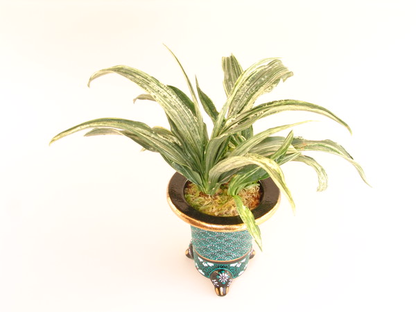 葉長20cm、葉幅4cm内外の中型種。細かいヨモギ色の斑が葉全体に現れ、雪白の大柄な図が入り、受け気味の葉姿に良い平たい葉、高い甲竜を現わし、類似した品種が少なく、古典的な美しさを醸し出す。性質は強健で、繁殖は普通、時折芯止まりすることがある。採光、肥料ともに強めにすると、綺麗な図が現れる。近年、図柄の良い木が減少して、保存に努めたい品種である。