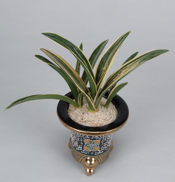 中立葉の、型変わりで一見して見分けのつく縞甲竜系統。姿も特徴的で、葉先が独特な丸味をみせる。覆輪は深く、肉厚の葉に、荒々しい雅糸竜と、玉竜が現れ迫力のある品種。性質は強く、採光、通風、施肥ともに普通~強め。縞甲竜系統では型変わりの際立った存在。
