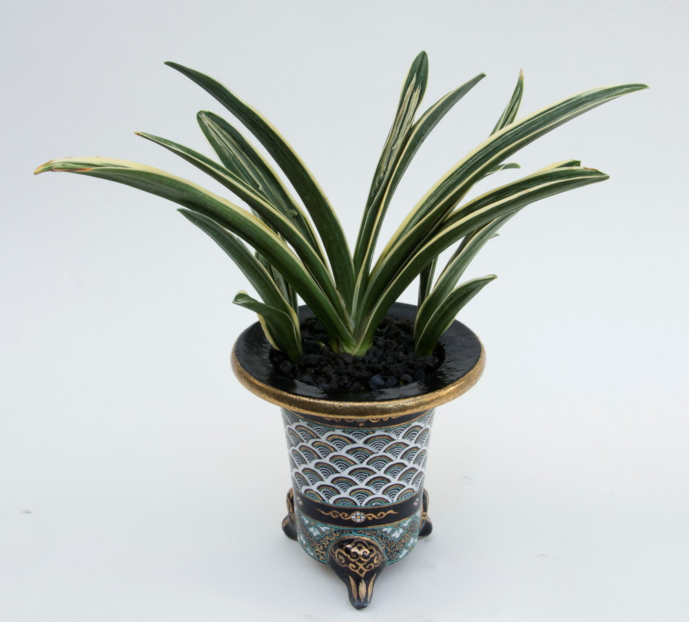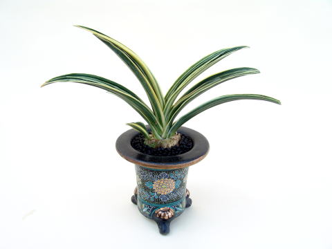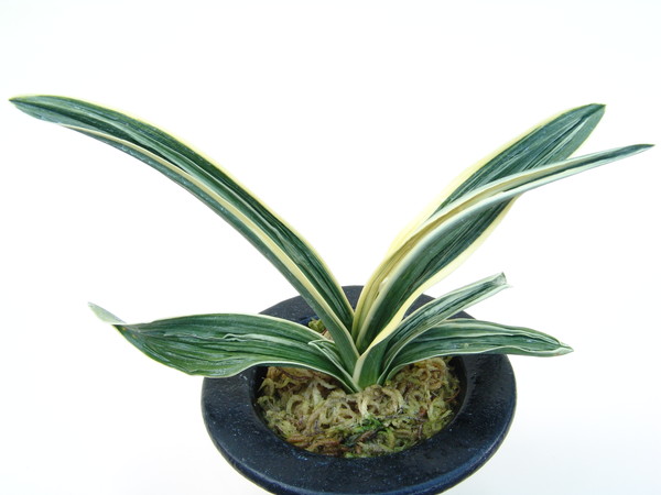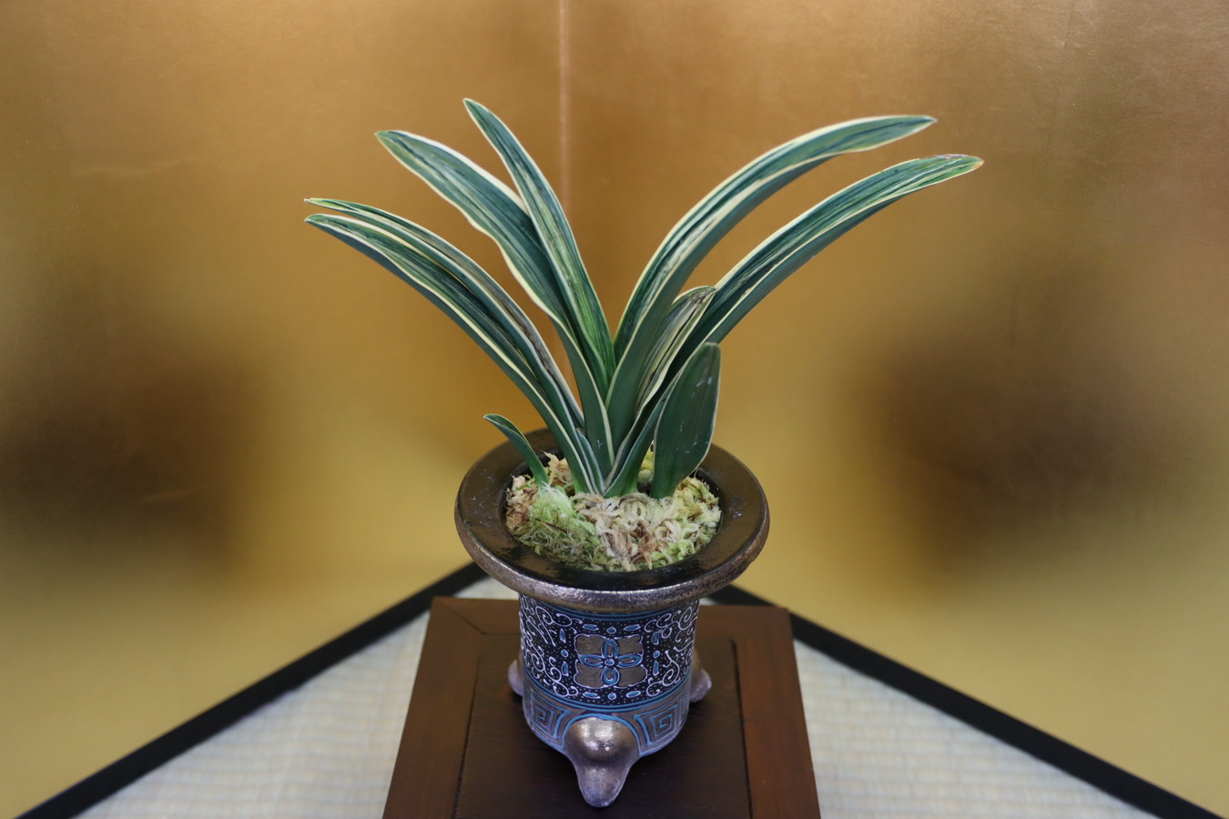 とても丈夫な縞甲系統雅糸竜と玉竜が乗り、V字型の姿も美しい。葉幅を広く作ると太陽に似る。この木は特に覆輪が深いですね。中立葉の、型変わりで一見して見分けのつく縞甲竜系統。姿も特徴的で、葉先が独特な丸味をみせる。覆輪は深く、肉厚の葉に、荒々しい雅糸竜と、玉竜が現れ迫力のある品種。性質は強く、採光、通風、施肥ともに普通~強め。縞甲竜系統では型変わりの際立った存在。