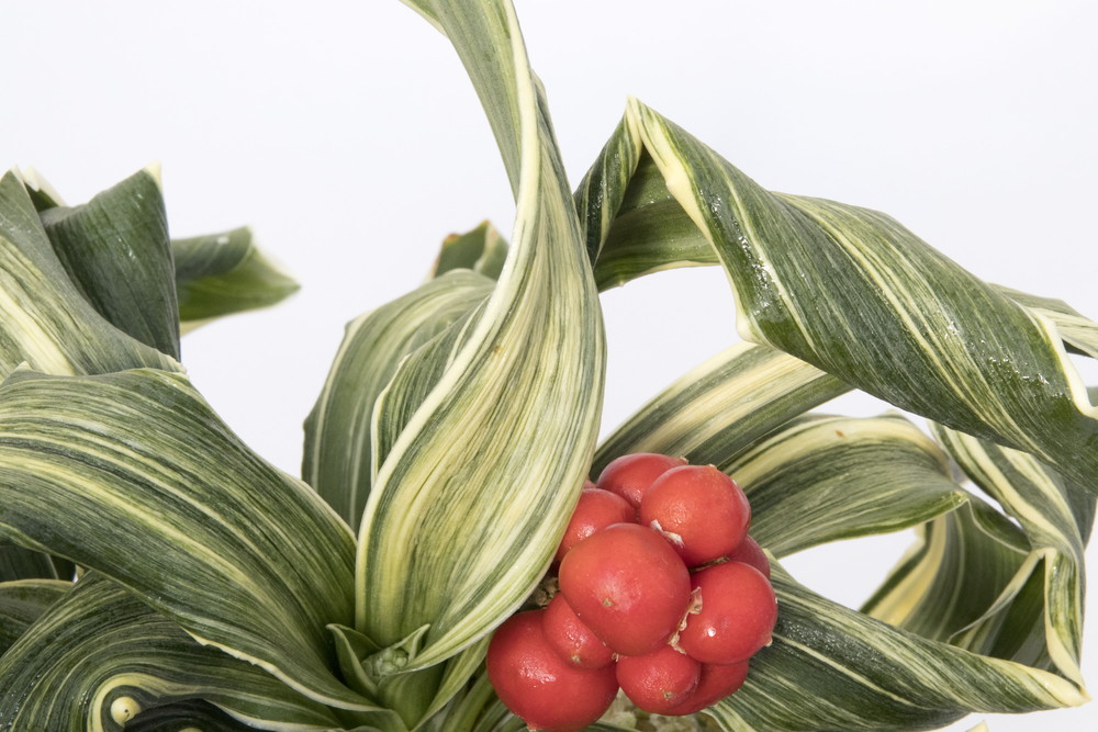 中から大型の獅子。親になると総雅糸竜が昇り、黄金色に輝く。その緻密な芸が素晴らしいことと、他の獅子よりも葉持ちよく大きくなりやすいため、私たちは交配親の♂や♀にも使っています。花が咲き、赤い実が付くとまた圧巻。