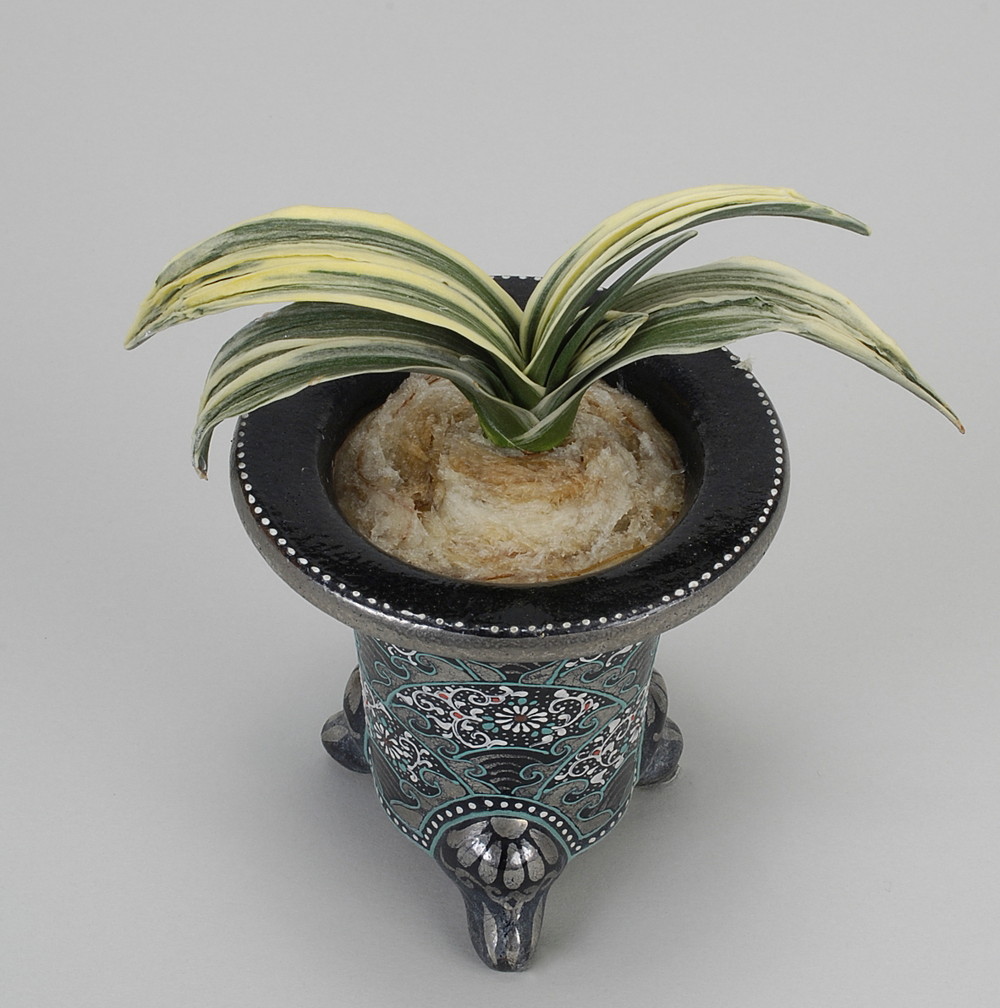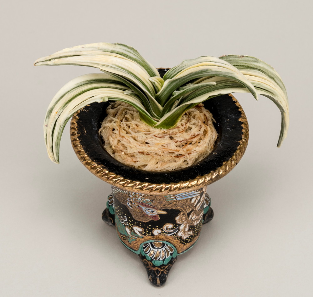 葉長8cm、葉幅3cm内外の中型種。濃紺緑色の地会いに黄白色の大覆輪を現す。葉の表全体に帯黄白色の糊を引く総雅糸竜は、厚い葉肉とともに魅力がある。剣葉、鈴虫剣を現します。性質は強健で、採光・施肥とも普通で良い。繁殖は普通で芋吹きが多い。