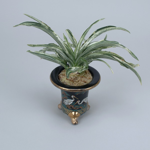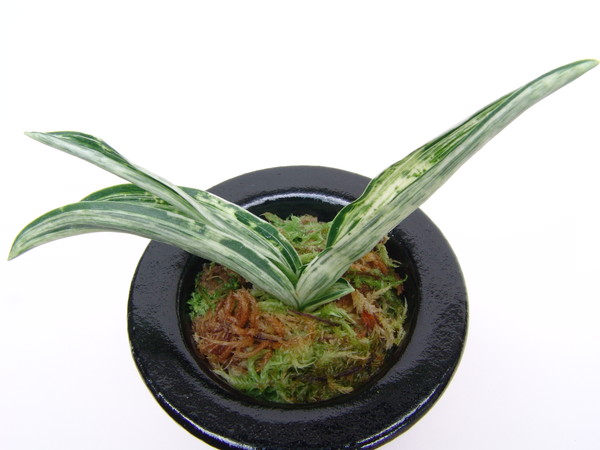 安政4年に作出された「根岸の松」に図があらわれたもの。葉長15㎝、葉幅3㎝内外。葉先は尖り、扇状に開いた葉姿は女性的な品の良さがある。鮮明に入る図は根岸斑と調和して美しく、扇に描かれた錦絵を感じさせる。図性の違いにより二宮、河原井、榎本、館山などの各系統に分かれ、変わらない人気を保っている。また最近では、固定された感のあった図性に変化が現れ、新しい図性の系統を確立する夢を追うマニアが増えています。図性の良いものほど性質が弱く、採光と施肥のバランスに気をつける。