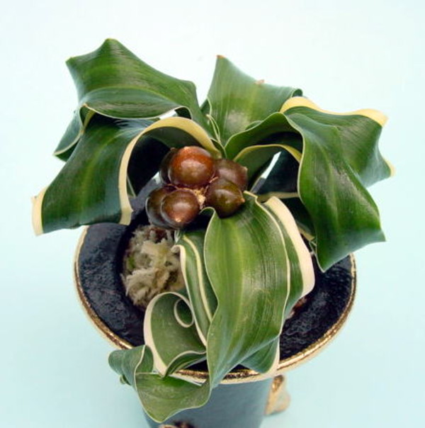 おもとには実際<獅子>というジャンルがあり、様々な獅子を楽しんでいる人がいます。この品種は明治の始め頃からあったといわれています。『玉獅子』に虎ののったものは『玉獅子の虎』といい、長い年月を経た今でも獅子系最高貴品です。