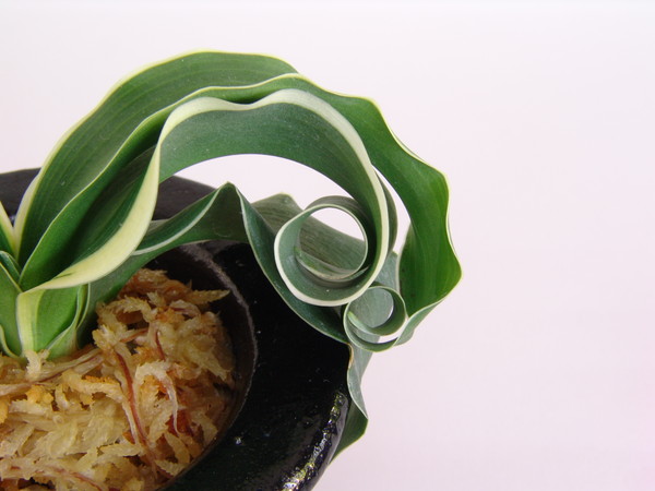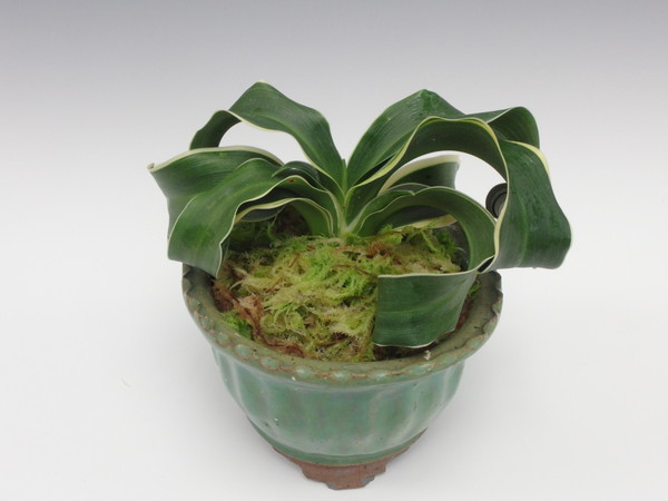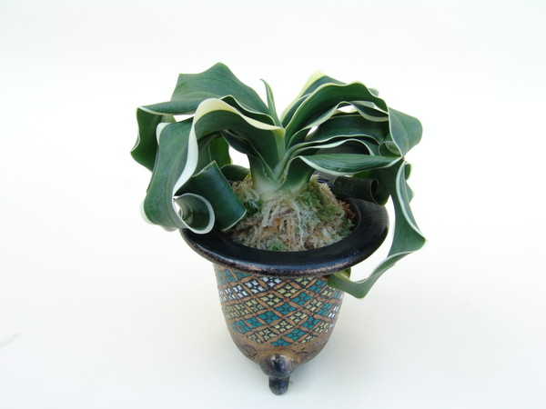 獅子系統の中で芸を現さず、葉姿で魅了します。芯の立ち上がるものは花芽。「玉獅子」の名らしい、玉を描く巻き。