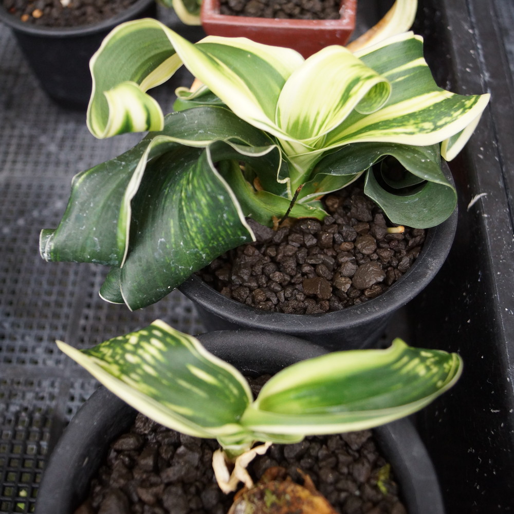 「玉獅子」に鮮やかな純白の虎の現れたもの。葉は艶消し地になって紺性よく、雪白の白い虎が現れた容姿は実に美しい。甲竜はなく、白い覆輪が葉元から先まで覆う。巻き方は穏やかな丸巻で、葉先が特に巻き込む。本種の歴史は古いが、いまだに不動の人気を保っ獅子系の最高貴品である。性質はやや弱いので肥料は控えめに、日光は生育期には十分採る。