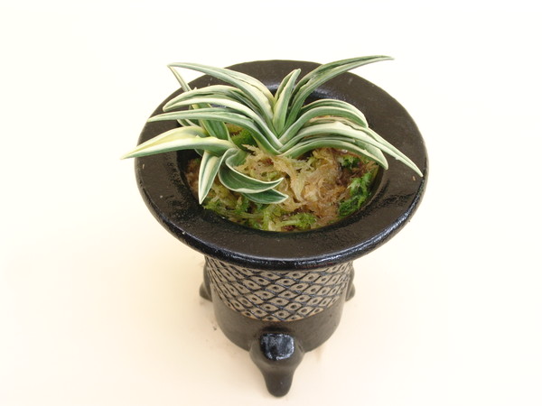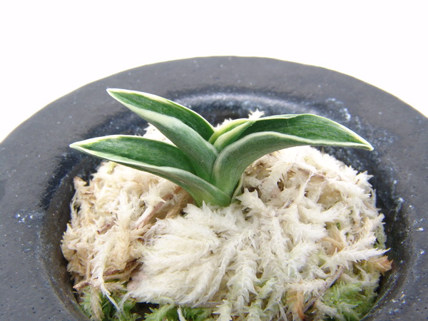 富国殿 (ふこくでん) 5年生、2年目の子付 羅紗四天王、万年青四天王とも呼ばれていたおもとを代表する木。羅紗では、「天光冠」と「富国殿」という対照的な2つの羅紗を中心に発展してきた歴史があり「富国殿」は若い頃は優美な美しさがあり、純白の覆輪、のりをひく葉にはついうっとりと見とれてしまいます。