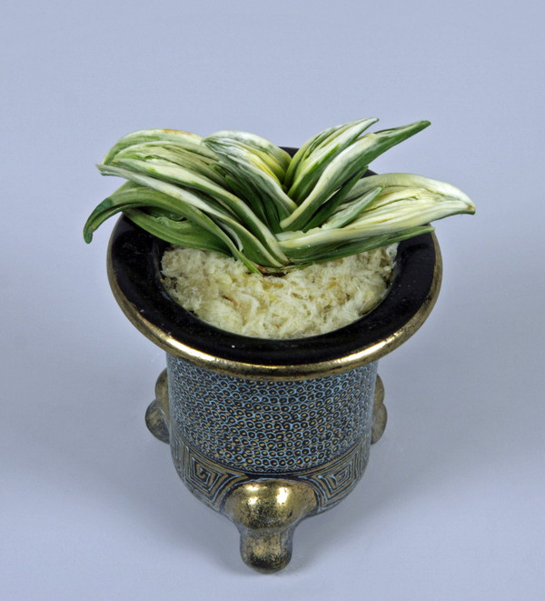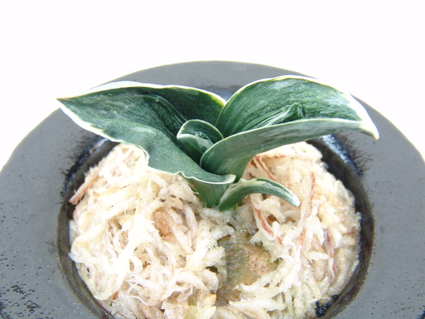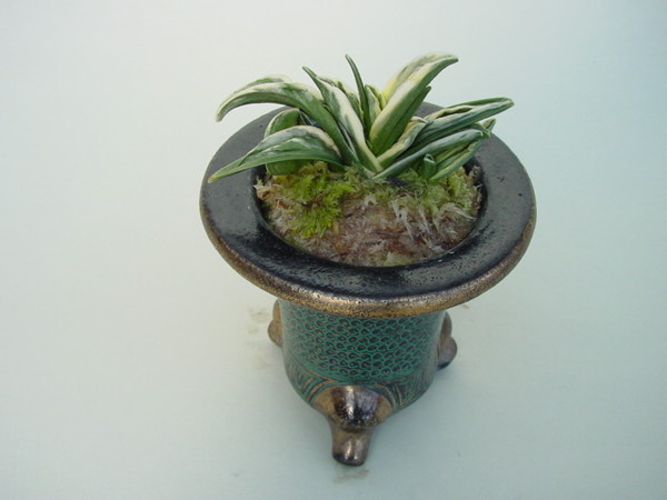 鸞山(らんざん)芸の横綱品種。中~小型の姿の中に、芸の奥深さが詰まっている。中立ち葉の葉は柚子肌で紺性強く、葉長は短い。若い頃の覆輪は浅い。親になるまでに、熨斗葉、剣葉、盛り上がる総雅糸竜と、芸と葉肉の変化は面白く、同じ品種かと見違えるほど。性質は強健で採光、肥料も充分に。芋吹きが主、子上げも。