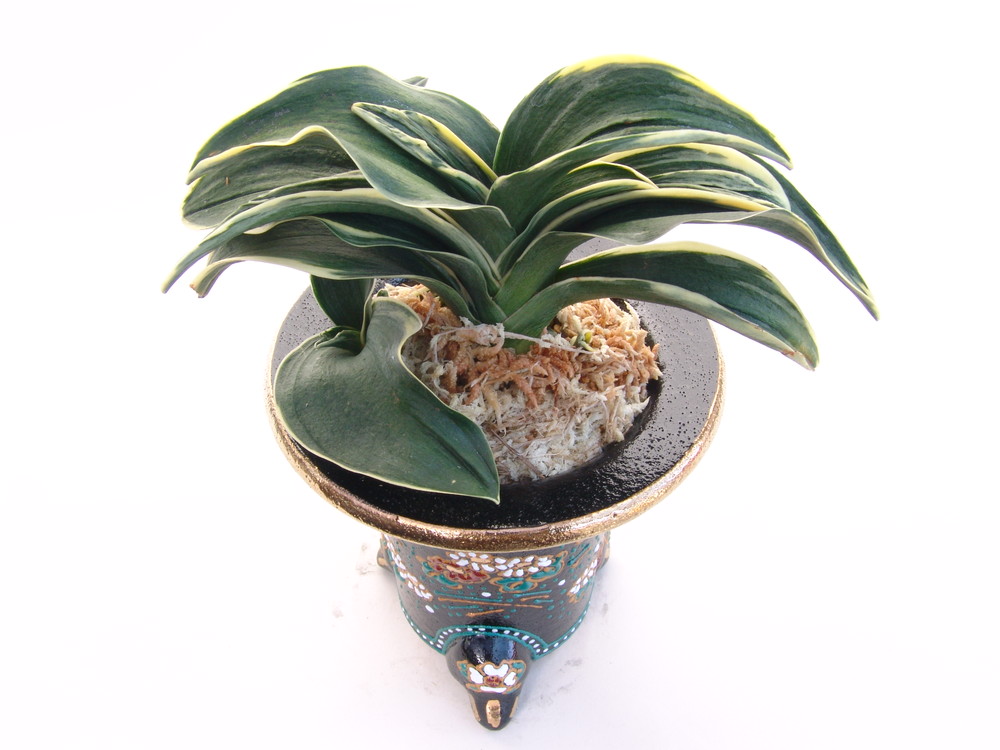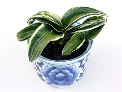 中型種、丸葉型の代表種 濃紺緑色に白い覆輪を見せます。熨斗葉、を現す丈夫な入門品種。採光を強く管理すると覆輪が深くなります。性質は丈夫で作りやすい。子上げ特に良い。