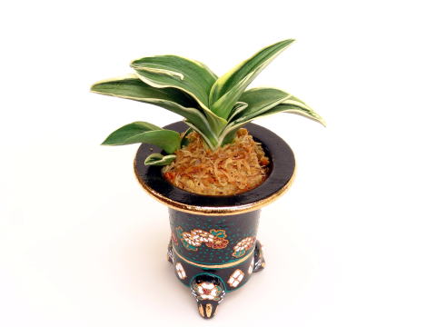 明治26年、内国博覧会にて明治天皇がお買い求めたおもと。若いころの愛くるしい丸葉は引越しおもとにしても人気。折下げの良い丸味のある葉に芸を現し、名前の通り子上げの良い可愛らしい中型種。「お多福」を元木とした「お多福の図」、縞の入る「福錦」も人気。性質は強く、採光・肥料は普通。