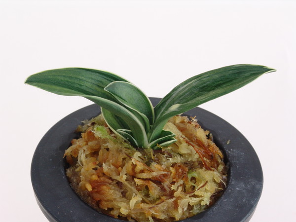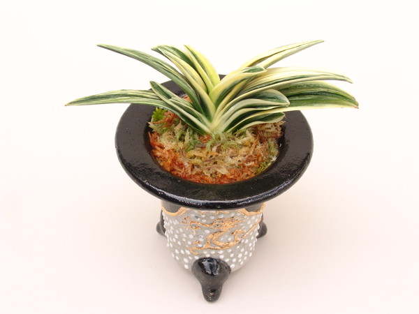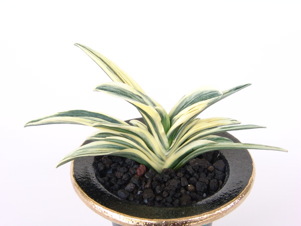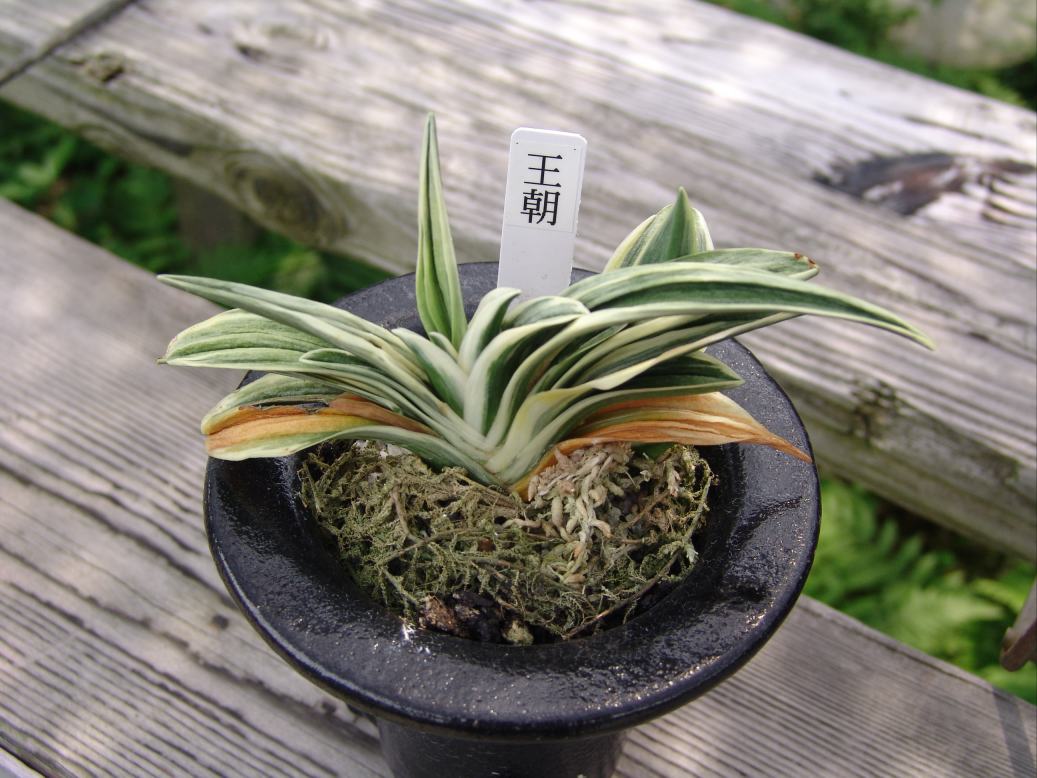 王朝 (おうちょう) 3年生 鉢3.5号 小型種。昭和40年頃は『津崎実生』と呼ばれていたが、芸が進化し十年目の昭和45年に大銘品として評価されるようになった。葉先はやや尖り、葉幅は2㎝内外で、葉肉の厚い中立ち葉型である。白の大覆輪をかけた力強い線に特に魅力が感じられる。柔らかい地合い、剣葉、熨斗葉、盛り上がる雅糸竜は乳白色で味わい深いものがある。容姿は均整のとれた美しさが感じられる。性質は強健で子上げが良い。採光・施肥ともに普通。