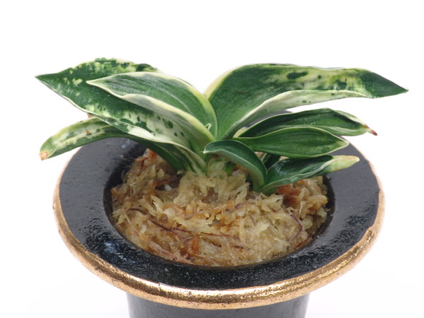 羅紗図もの代表品種。「お多福」の丸味のある葉に、雪白の図が打ち込むように現れる。地の緑が多く、他の羅紗図ものと比べても図のコントラストが美しい。歴史も古く、白さが素晴らしい「塩村性」が有名。羅紗図物の特徴として、元木より少し小型になる。作をかける時も小型にに作り込むと図量がおおくなる。性質は「お多福」に同じ。