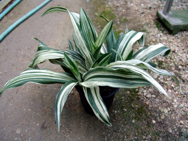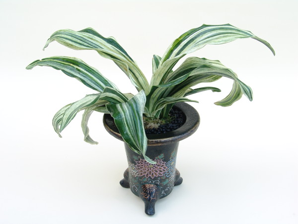 持って入ったとされる伝説のおもと。白く細く入った繊細な永島斑(白斑とも)に、濃紺の縞をみせる希少保存品種。葉幅3~4㎝、葉長20~30㎝の中型から大型種。斑の美しさと歴史、威厳ある美麗品。性質は普通。採光、肥料も普通、子上げで殖やし、繁殖は普通。