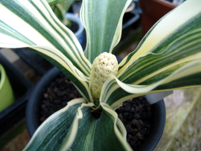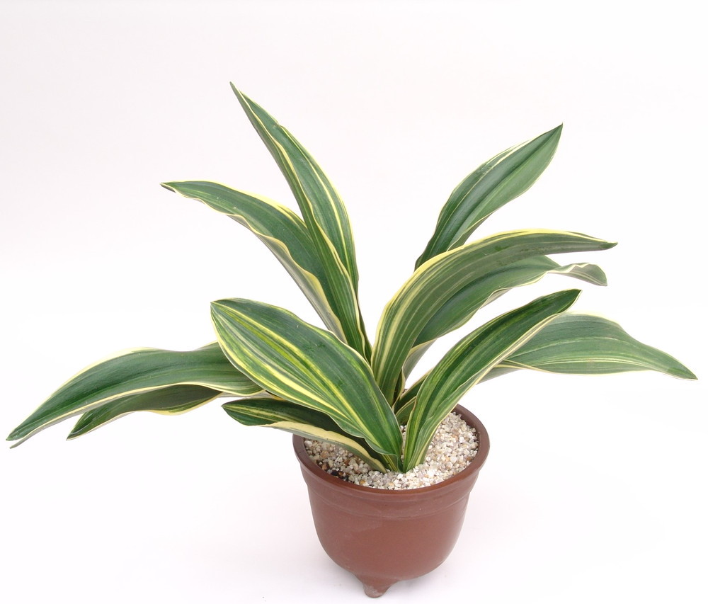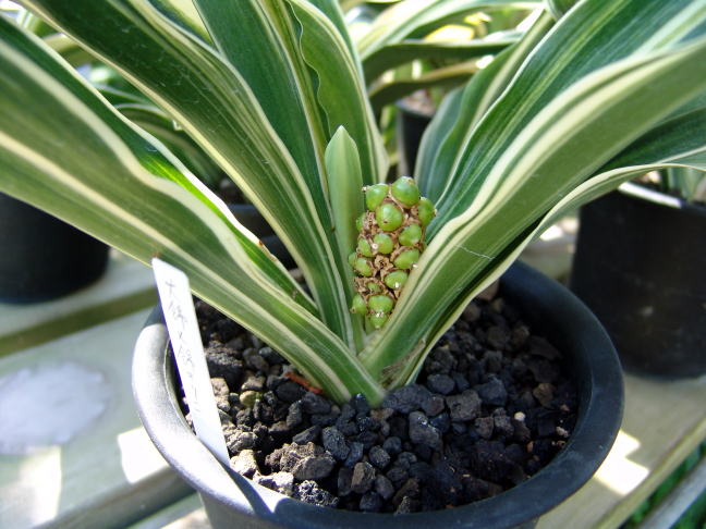 大錦(おおにしき) 17cm鉢 8年生 葉長30㎝、葉幅13㎝、立ち葉で中ふくらみの軍配のような葉は美しい縞柄を楽しむにはぴったり。花芽が良く上がるので、実付きでも、交配親としても楽しめる。