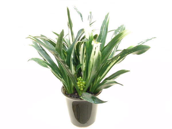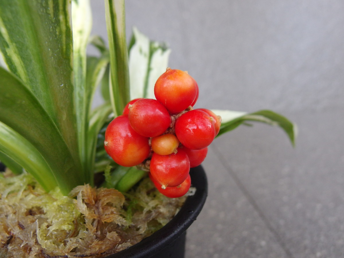 江戸時代からの品種で古くは「水菜虎」と呼ばれていた。紺性の強い葉に白虎が大小様々に入り美しい。葉先尖り、細葉の立ち葉性で葉繰り良く、自然な葉姿。葉長20㎝の中型種。性質は強健で肥料は強め。春の日を当てることで虎柄がしっかり現れ、子もあがり、株立ちになりやすい。地植えにも向く品種。赤い実も付く。