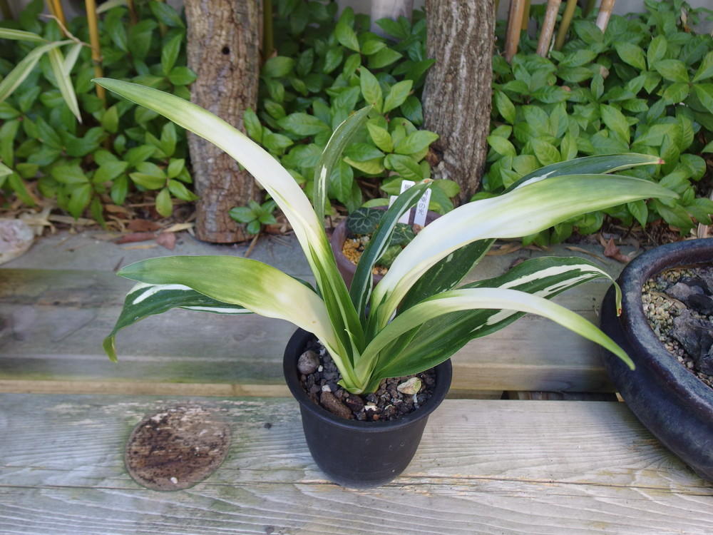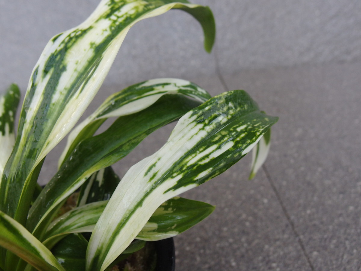 白牡丹 朝の陽を採ると白虎がはっきり現れます。陽のとりようで柄の変わる品種です。この状態から陽の当たらない場所に移すと白い部分の緑が多くなります。