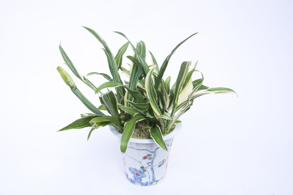 珍品。葉の裏側に芸を現す裏芸系統。葉が返り返ったり、筒状になったり、葉裏に突起(逆鉾芸)をみせたり笑っているような姿を見せる変幻自在の品種。縞のあるものを「初笑」、ないものを「逆鉾」と呼ぶ。図の入った「逆鉾の図」もあり、それぞれ表情が異なる。性質は強健、子上げも良い。肥料、採光は普通から強め。