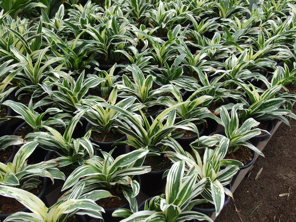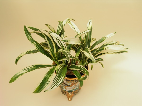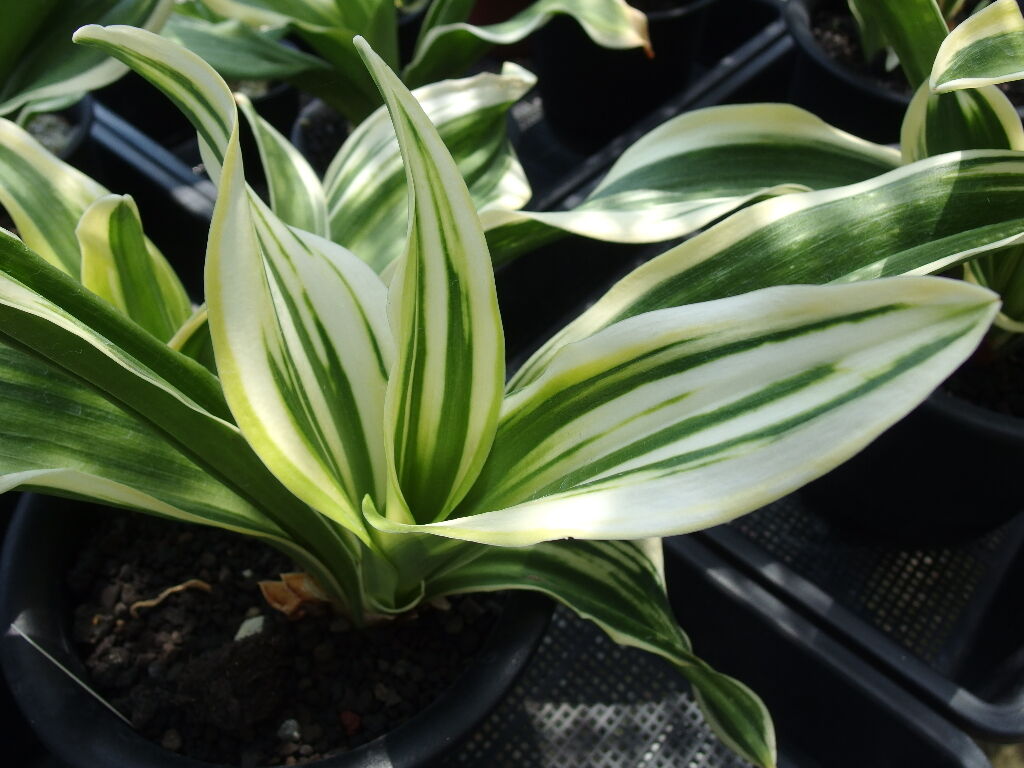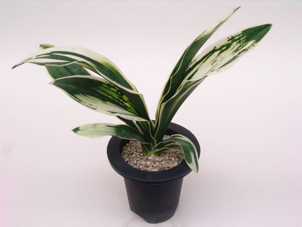 濃緑色の葉に雪白の虎斑を現し覆輪をかけます。葉は立ち葉で葉先少したれます。子出しの良い品種。性質は強、肥料・日光強め。