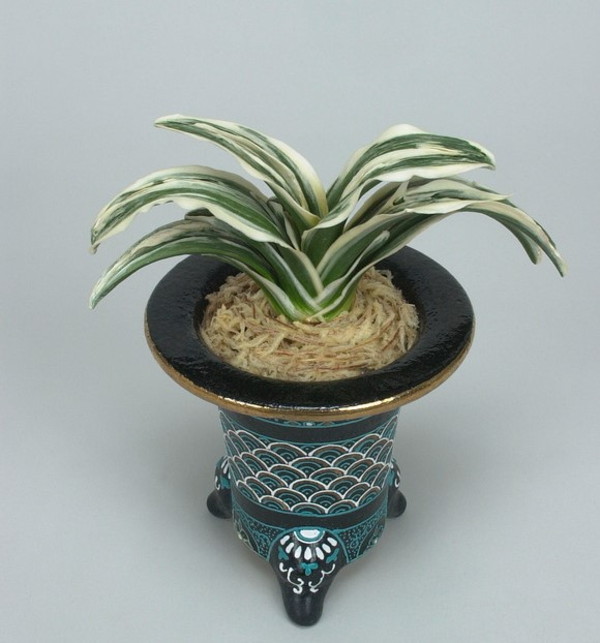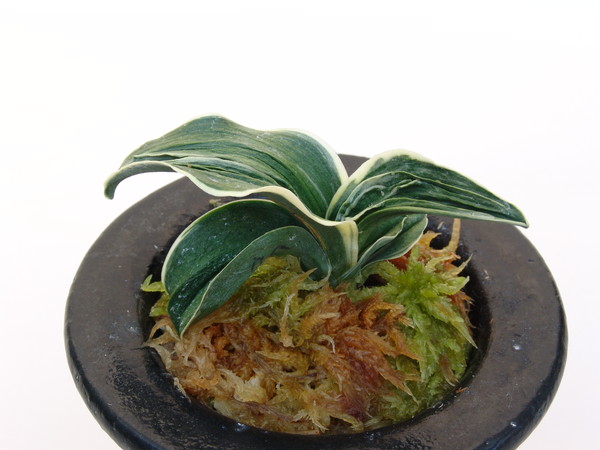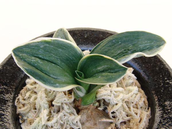 葉先は丸く、葉幅が広いのでずんぐりと丸味のある葉姿をみせる。濃紺の地合いに深く白い覆輪をかけ、葉肉は特に厚い。若木の高い甲竜、熨斗葉が低い雅糸竜に変化する。首の太さは重厚感があり、広く親しまれる。性質は強健。採光、肥料ともに強めのほうが葉数も多くなりよく育つ。子上げもするが、芋吹きが主で殖えは良い。