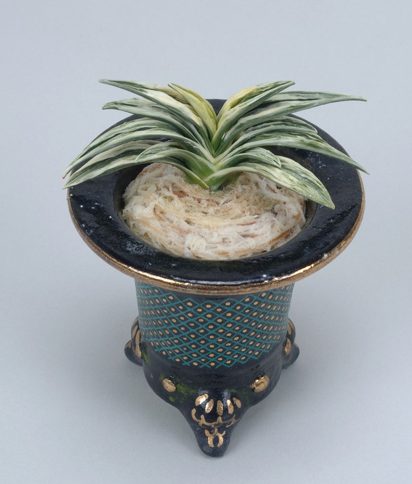 珠光 (しゅこう) 紺性強い4年生 鉢3.3号 明治末期、京都の新川房次郎氏が栽培していたものである。小型種で葉幅は細く立ち葉となって葉先鋭く尖る。濃緑色の紺性は緻密な地合いとなり、左右の均整も良く、肉厚の葉が整然とした雅糸竜に覆輪で覆われると端正な葉姿となる。性質は強健で非常に育てやすい。採光、施肥とも普通で良い。子上げもするが、繁殖は芋吹きが良い。愛嬌も大変良く、ぜひ栽培してみたい品種である。