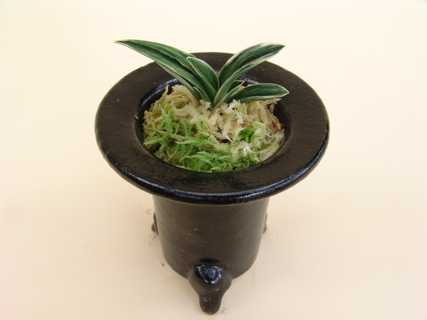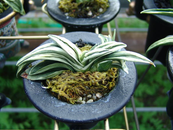 鋭い葉先、純白の雅糸竜は盛り上がり、肉厚の羅紗らしい葉をみせる。小型でしまった姿は、本種のきりりとした魅力を引き出している。若いうちの紺地の強い緻密な地合い、葉姿の乱れることのない端正な姿も魅力の作り易い品種。性質は強健、採光、肥料は強め。芋吹き良く吹き上がり、子上げもする。