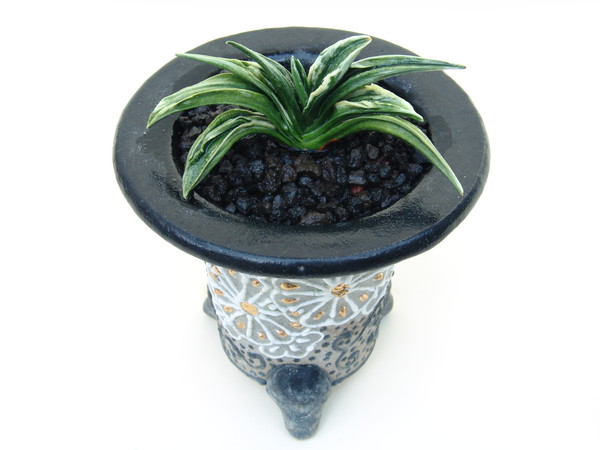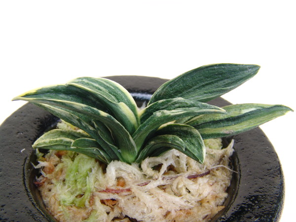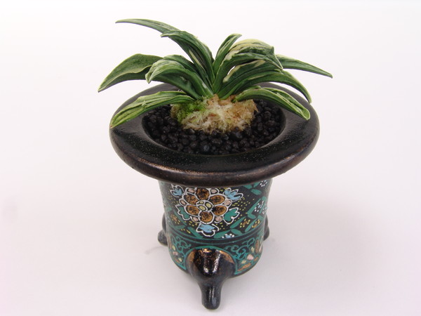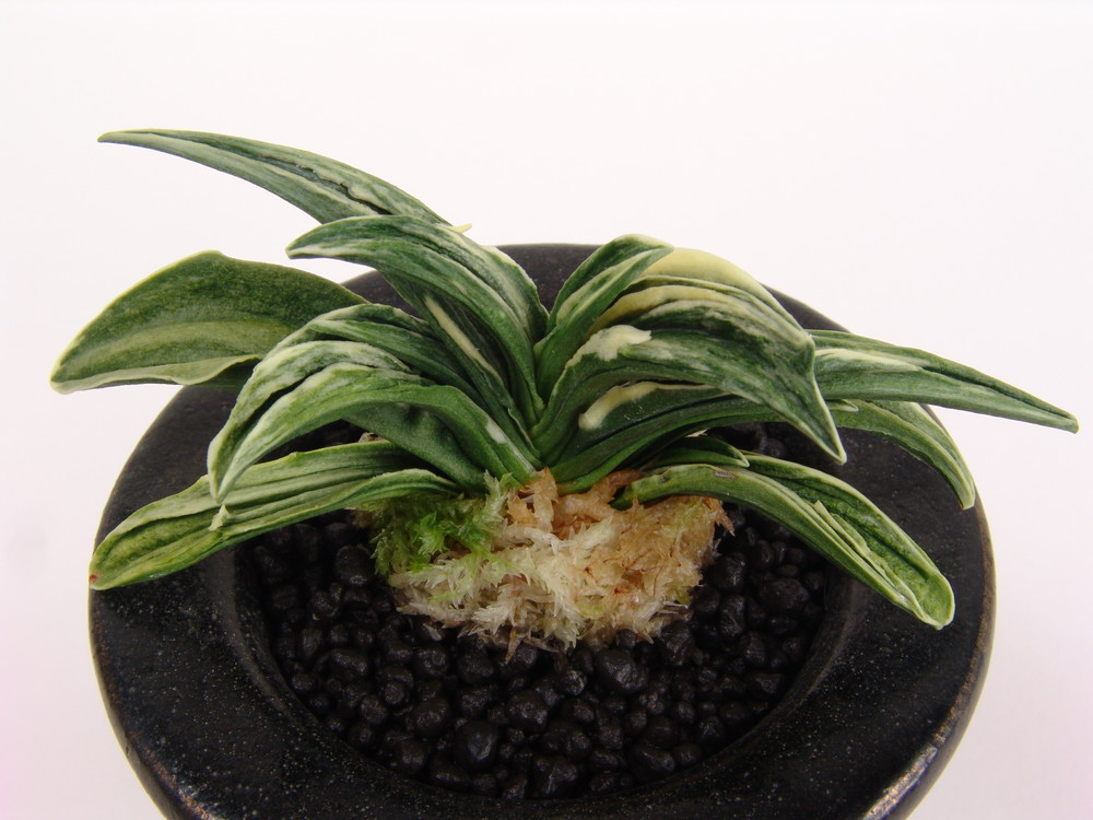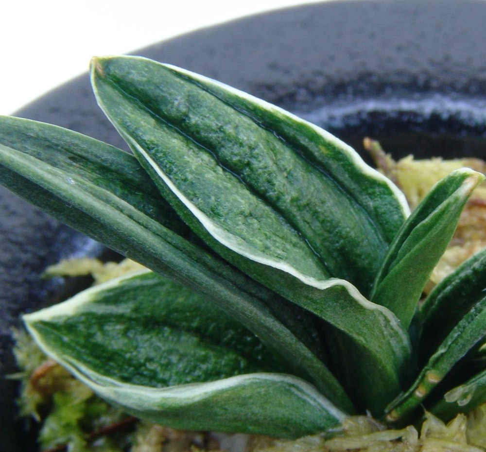 柚子肌地の代表品種で、小型種。紺地が特に強く、矢筈状に入る純白の覆輪が際だつ。渋い。その渋さは派手好きな趣味者も魅了するぐらい、魅力がある。この品種を見ていると癒される、といわれるお客様は多いです。こういった品種は、特に古鉢が合います。明治の古鉢に植えて。古鉢の黒との調和がいい。