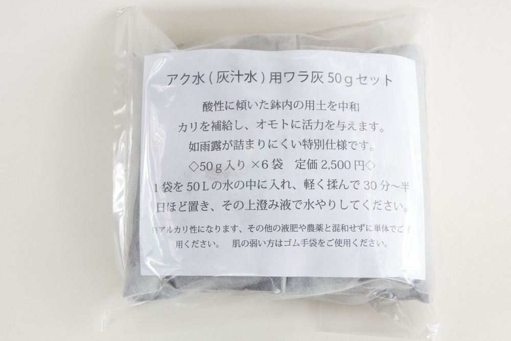 (10g入りは10Lに希釈すること、50g入りは50L) 1袋を所定の容量の水に入れ、袋が破れない程度に揉んで中の灰を水になじませて30分から半日ほど置き上澄み液を使い潅水してください。 一例として、春と秋の生長期に月に2度ほど与えるのをオススメします。人により年中使われる方も居られます。 ※注意事項 ※アルカリ性になりますのでその他液肥や農薬と混ぜずに単体でご使用ください。草木灰(アルカリ)と反応する化成肥料(硫安や酸性複合肥料等)が御座いますのでお使いの肥料の注意書きもよく御覧ください、置き肥は有機質肥料が安心です。 肌の弱い方はゴム手袋をご使用ください。冷暗所で保管してください。