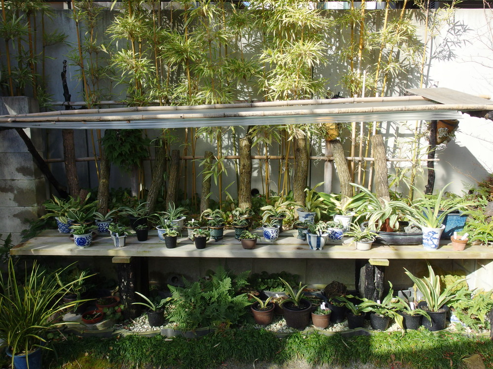 屋外に置く場合は、つねに不織布・寒冷紗を張りめぐらして風を防ぎます。この時期オモトを風にあてますと、葉の縁や葉先、あるいは斑や柄の白い部分などが葉焼けをおこして褐色になり、たいへんみにくくなります。