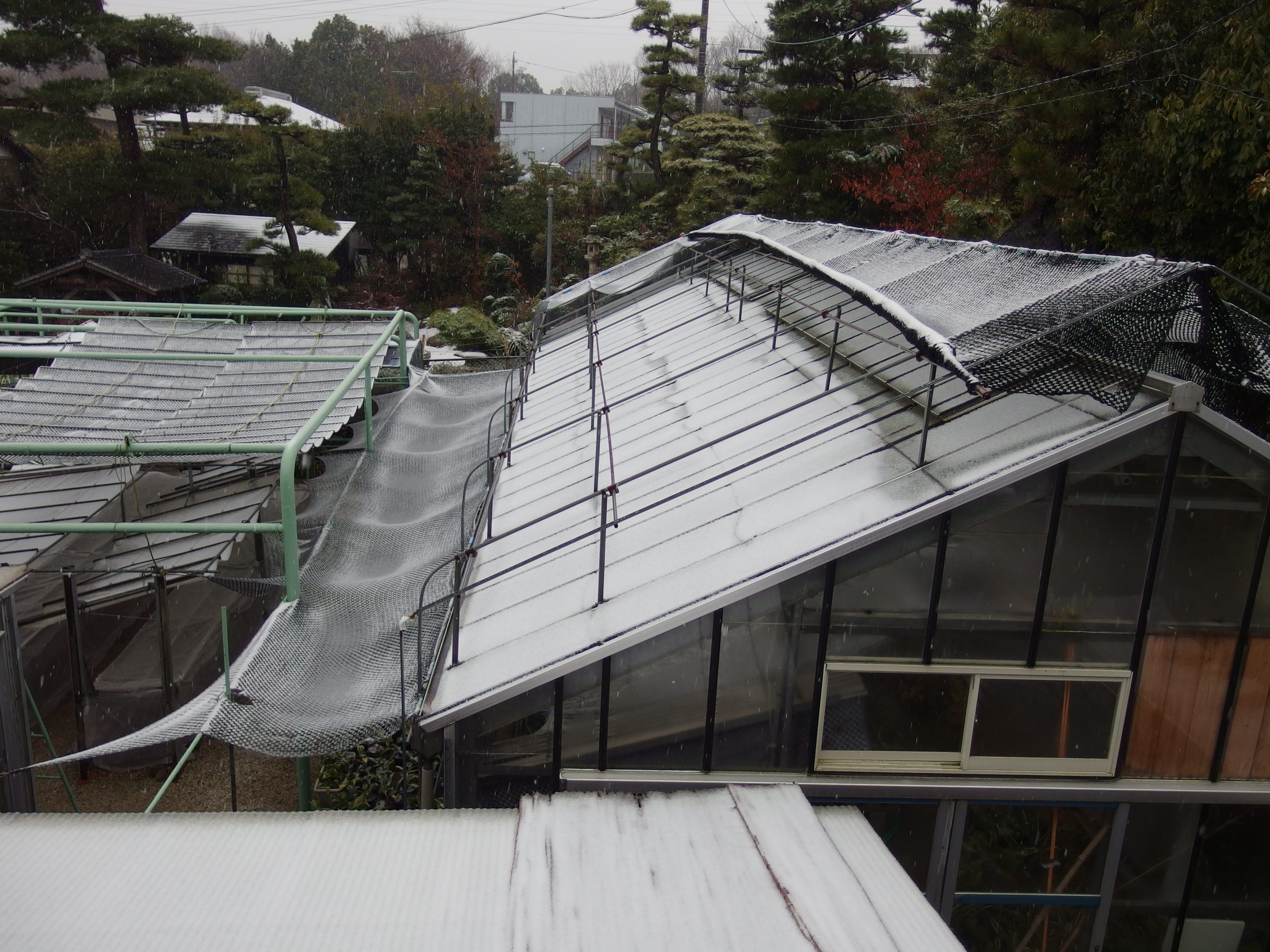 おもと岡崎豊明園第二温室 凍らせないように不織布で覆う。