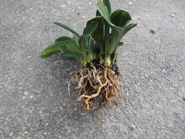 オモトの根っ子 新根が伸びて根毛も元気に出ています。新しい根は鉢の縁側に多く見られます。根っ子は鉢の中心部より外側の場所が乾きが早いので喜んで伸びていきます。