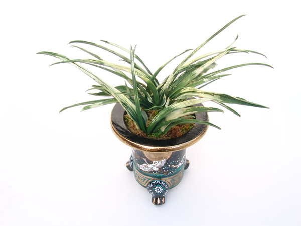 関白(かんぱく) 7年生 鉢5.5号 「翠光群雀系」に属する。濃紺色の葉に矢羽根状の矢筈虎が現れると見事なまでの美しさを見せてくれる。首元がやや広く、葉先が鋭く尖り、雅糸竜、二面竜、鈴虫剣、剣葉と多彩な芸を現す。ポピュラーな品種ながら、人気が高く、多くの人に栽培されている。矢筈柄をきれいに現すには十分な採光を行うことがポイントで、葉の幅が狭くなりやすいので、採光に見合った肥料を十分に与える。繁殖は良好で株立ちになりやすい。