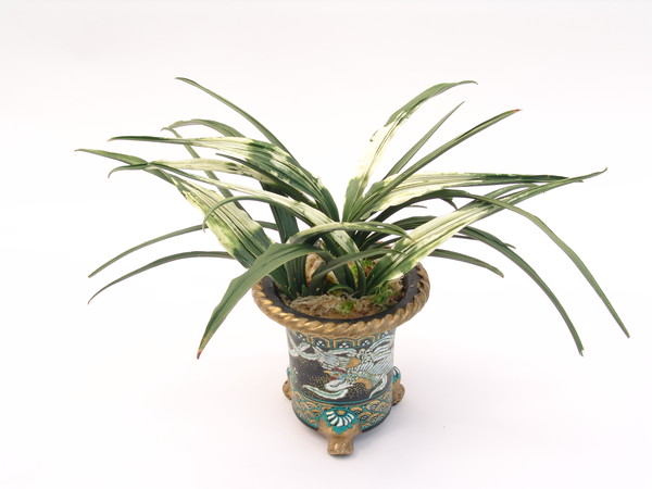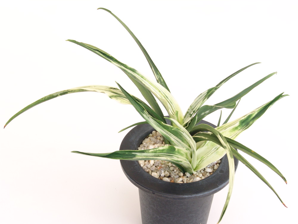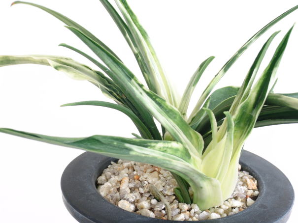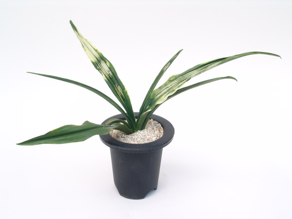 関白(かんぱく) 7年生 鉢5.5号 濃緑色の葉に雪白の矢筈虎を現す。葉先鋭く尖り、剣葉、二面竜、鈴虫剣を現す。白い矢筈虎をきれいに現すには充分な採光をおこなうことがポイント、株立ちになりやすい。性質は強健で作りやすい品種です。