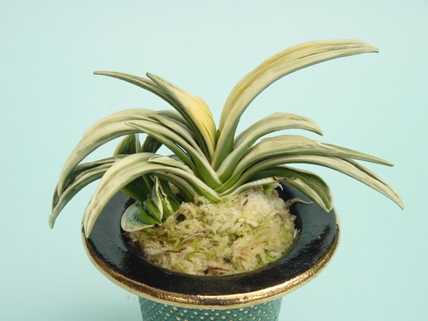 葉長7cm、葉幅3㎝内外の中型種。腰折れが低く、平葉型で、熨斗葉、本剣、棒葉、葉面溢れるばかりの総雅糸竜を見せる。濃紺地に純白の鮮明な覆輪をかける。葉面を純白な糊に覆われた姿は魅力的である。少し芋が柔らかいので、肥料は少なめが良い。子出し良く、繁殖は良い。