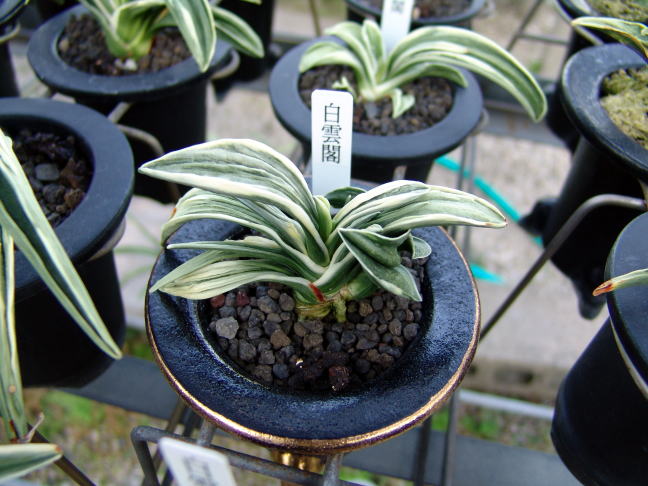 白雲閣(はくうんかく) 2年生鉢 3.5号 覆輪深くなり雅糸竜・剣葉を見せる。 |