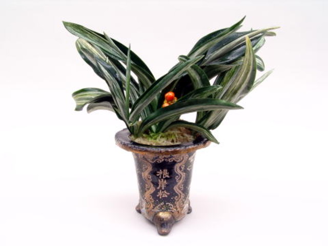 江戸おもととして非常に有名。今は多くの人が楽しんでいる千代田系統の元祖がこの根岸の松(ねぎしのまつ)です。今年が2018年なので、もう161年もたっているのですね。江戸万年青である五大州や残雪などの縞や図、金鶏のべっ甲柄などはありましたが、この根岸斑は当時なく、完全に新しいものでした。今の千代田系統の素晴らしい品種や、千代田獅子、千代田羅紗などの派生系統もこれがなければ生まれていないわけで、万年青界においては最重要な品種です。根岸の松のためだけに作られた写真の鉢も、それだけの価値のある「根岸松」だからそこ、と言えるでしょう。作りも最上級です。