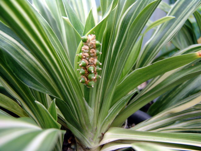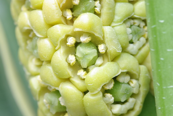 おもとの花芽 6月16日交配出来た花芽は膨らみ始めました。薄茶色の部分の花芽は実りません。 実になる部分は青く膨らんでいて先端に雄しべの花粉が付いています。
