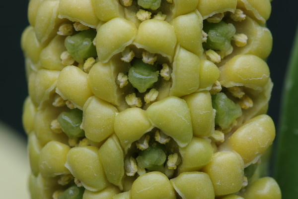 花芽が上がって少しすると、つくしの部分が少しづつ黄色くなってきます。そして、蜜がでて、独特なにおいがすると思います。そうなると交配、受粉の適期です。