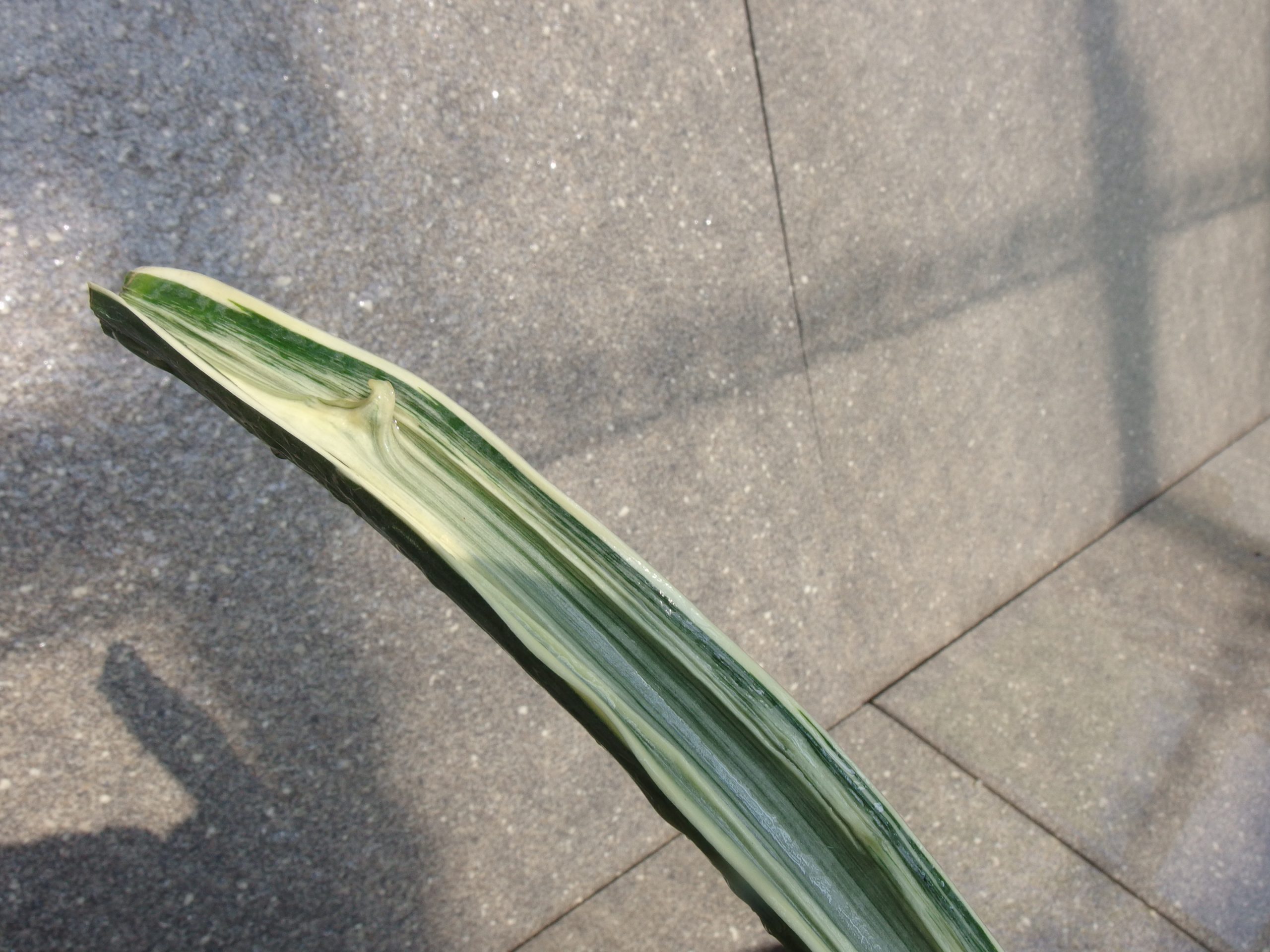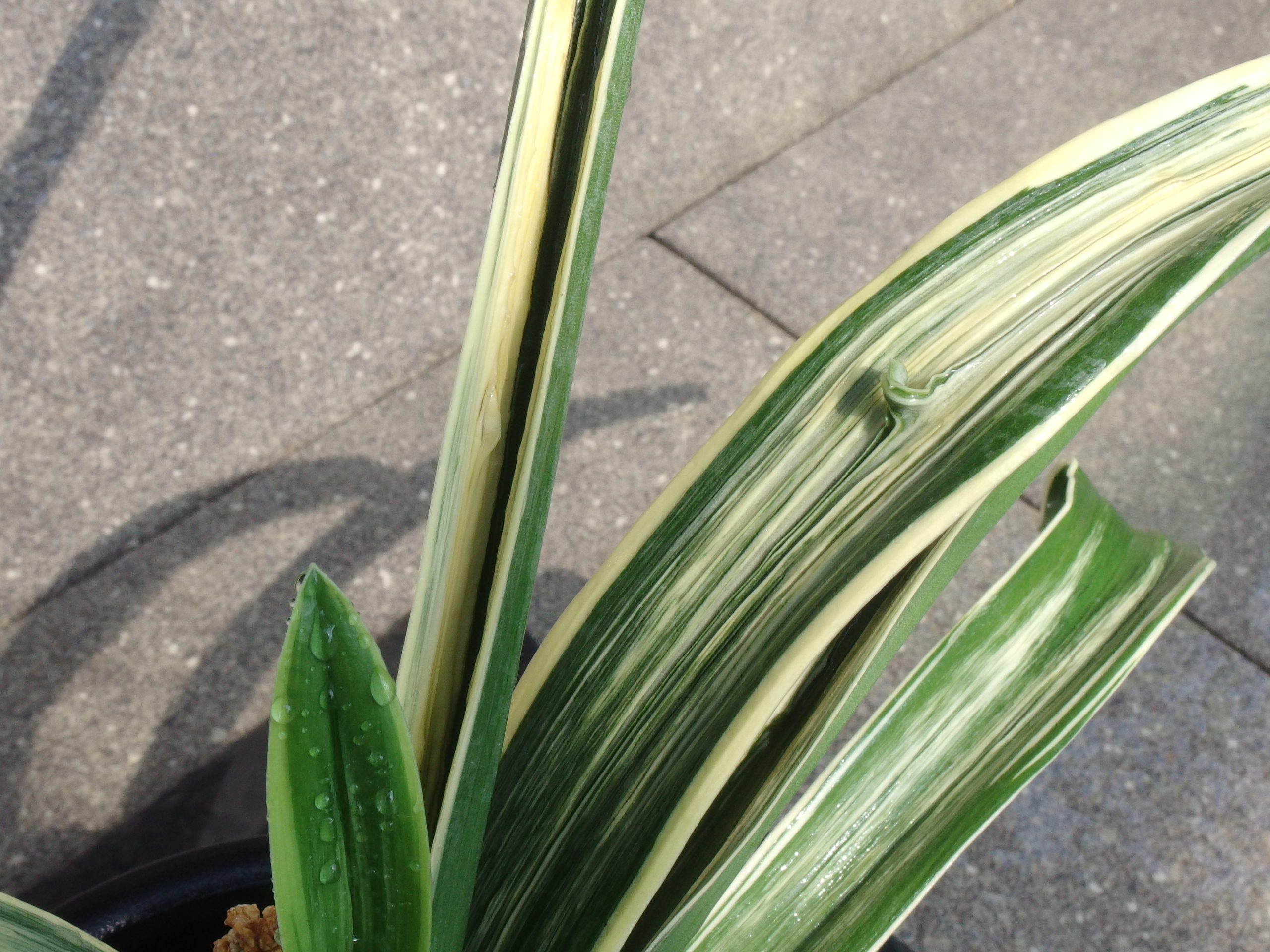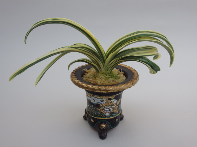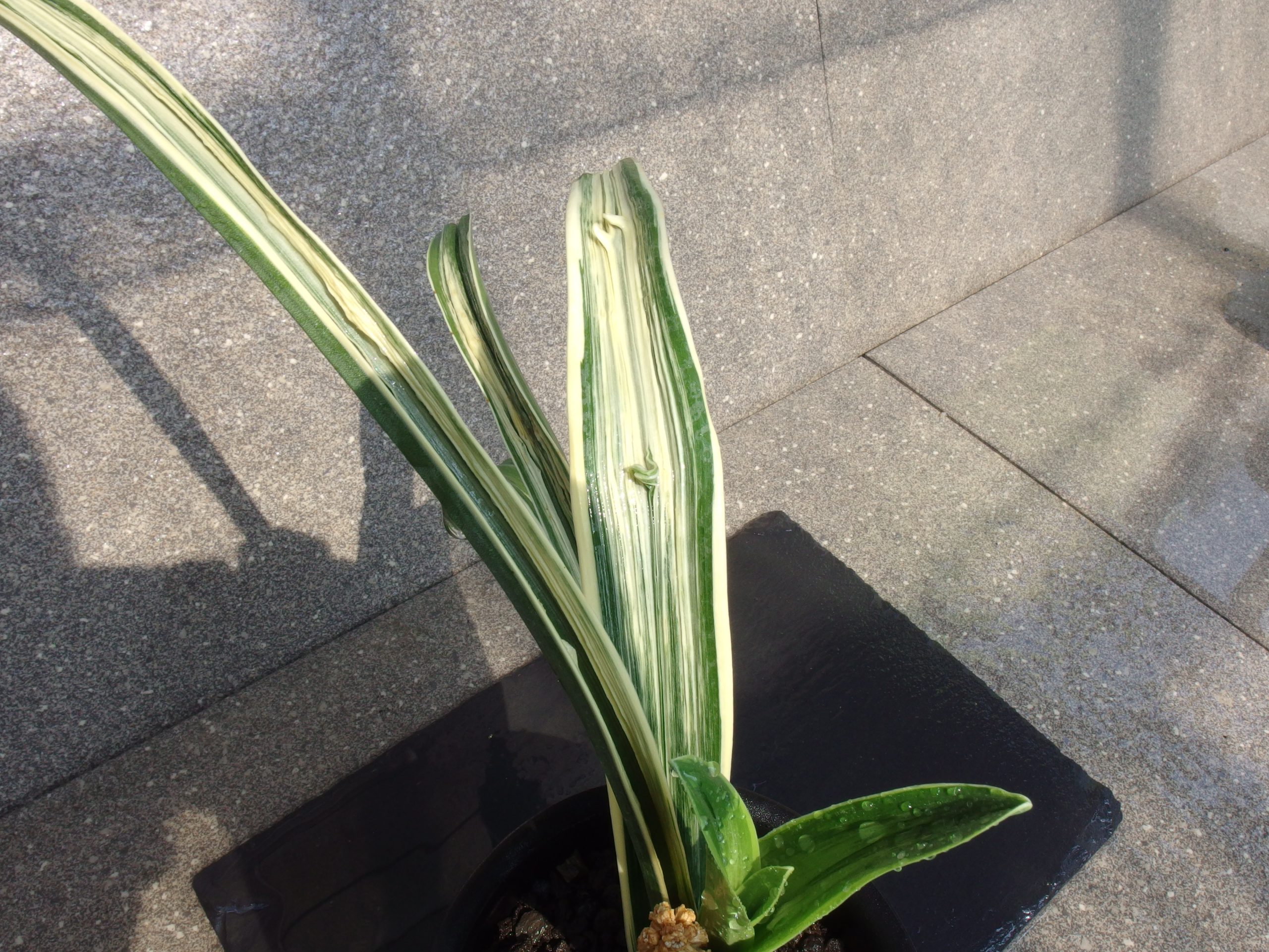 豊明海 (ほうめいかい) 鉢4.5号 縞甲系という雅糸龍を魅力的にみせる中型のおもと。その縞甲系の中でも葉幅は広く、迫力があります。濃紺の地質に雅糸竜を見せ小さな玉雅糸竜を見せます。この写真の木は、特に珍しい縞覆輪の木。濃紺の葉に覆輪のみの木ではどっしりとした力強さを、この稀少な縞覆輪では力強さの中に華やかさを感じさせる姿になります。『光陽』、『太陽』、『萬陽』など、小型、中型縞甲と呼ばれるものは人気品種が多いですが、この『豊明海』はその中でも横にどっしりと構えた姿で、この写真の縄縁太鼓胴のような胴太の鉢や、盆栽鉢、山草鉢など世界が横に広がっていく鉢との相性もよいです。メインに『豊明海』を据え、脇に可愛い山草を飾れば、渋さの中に愛らしさを感じさせる玄関飾りや床飾りに。今は一本立ちが主流の時代なので素立で楽しむことが多いですが、この『豊明海』や縞甲系は株立ちの迫力は抜群。株立ちの鉢植えにして育てると、普通の黒鉢に入っていても誰もがまず目を引く、焦点になるおもとです。首が太くなるので、非常に力強い印象を与えます。