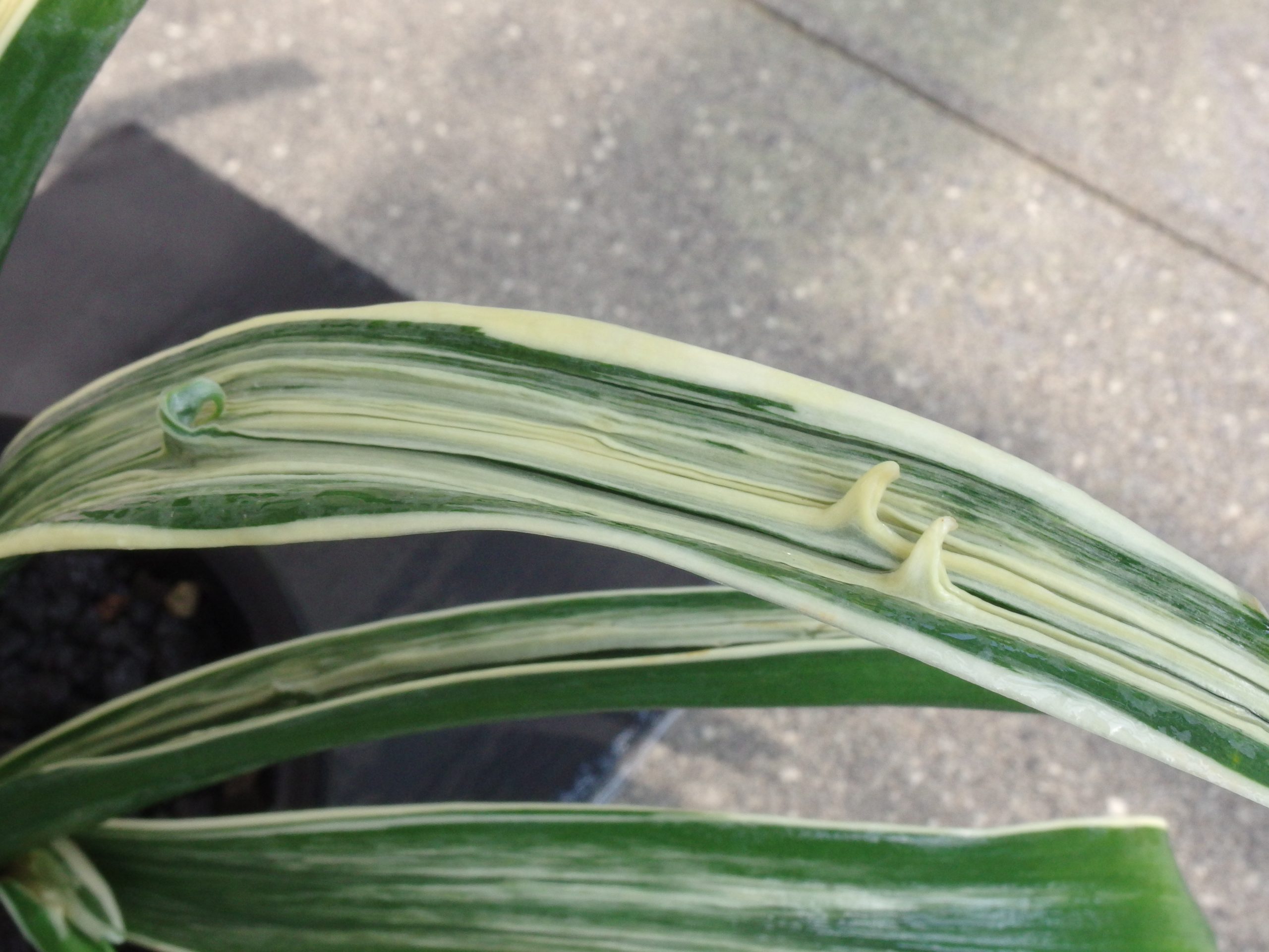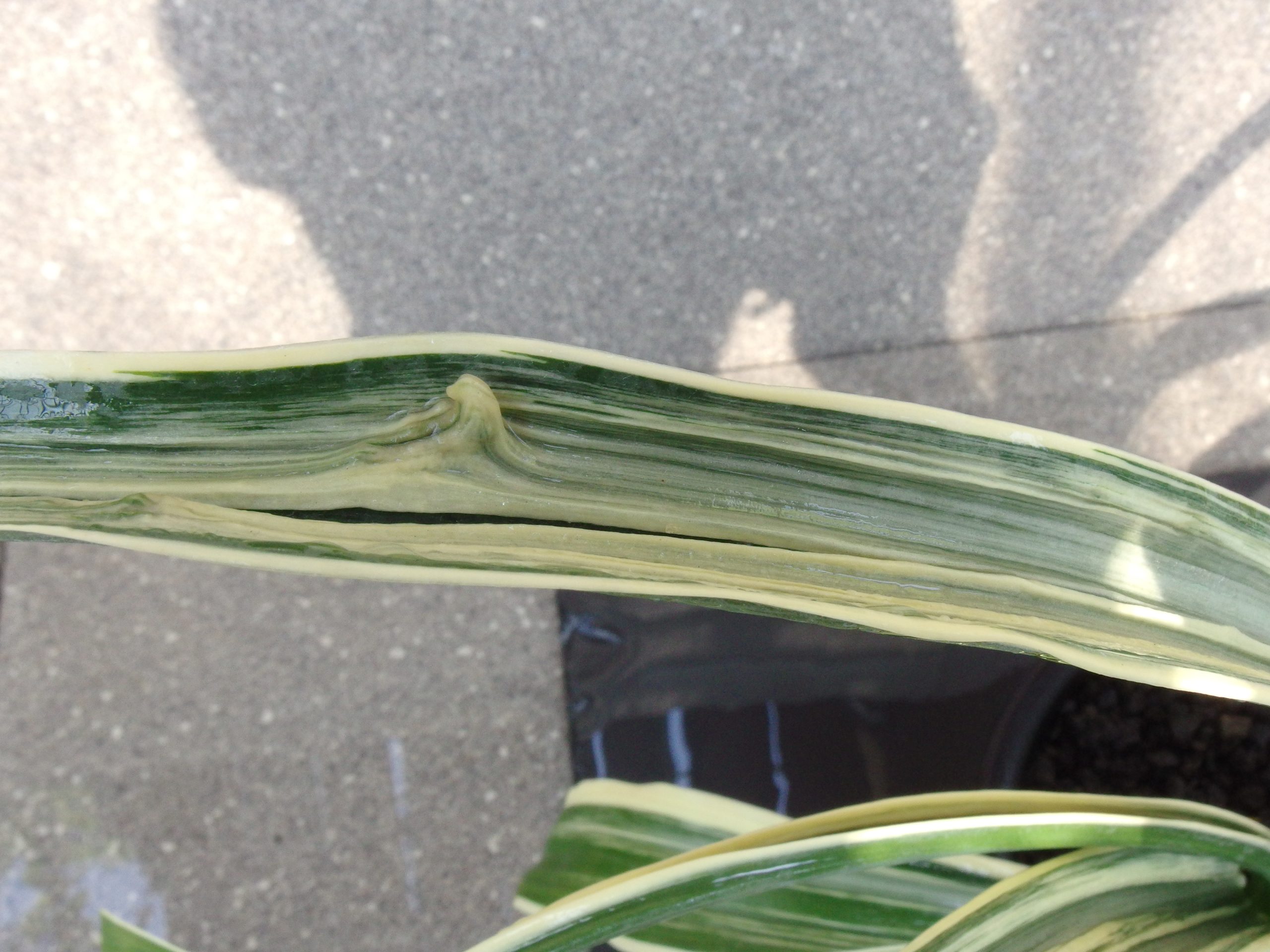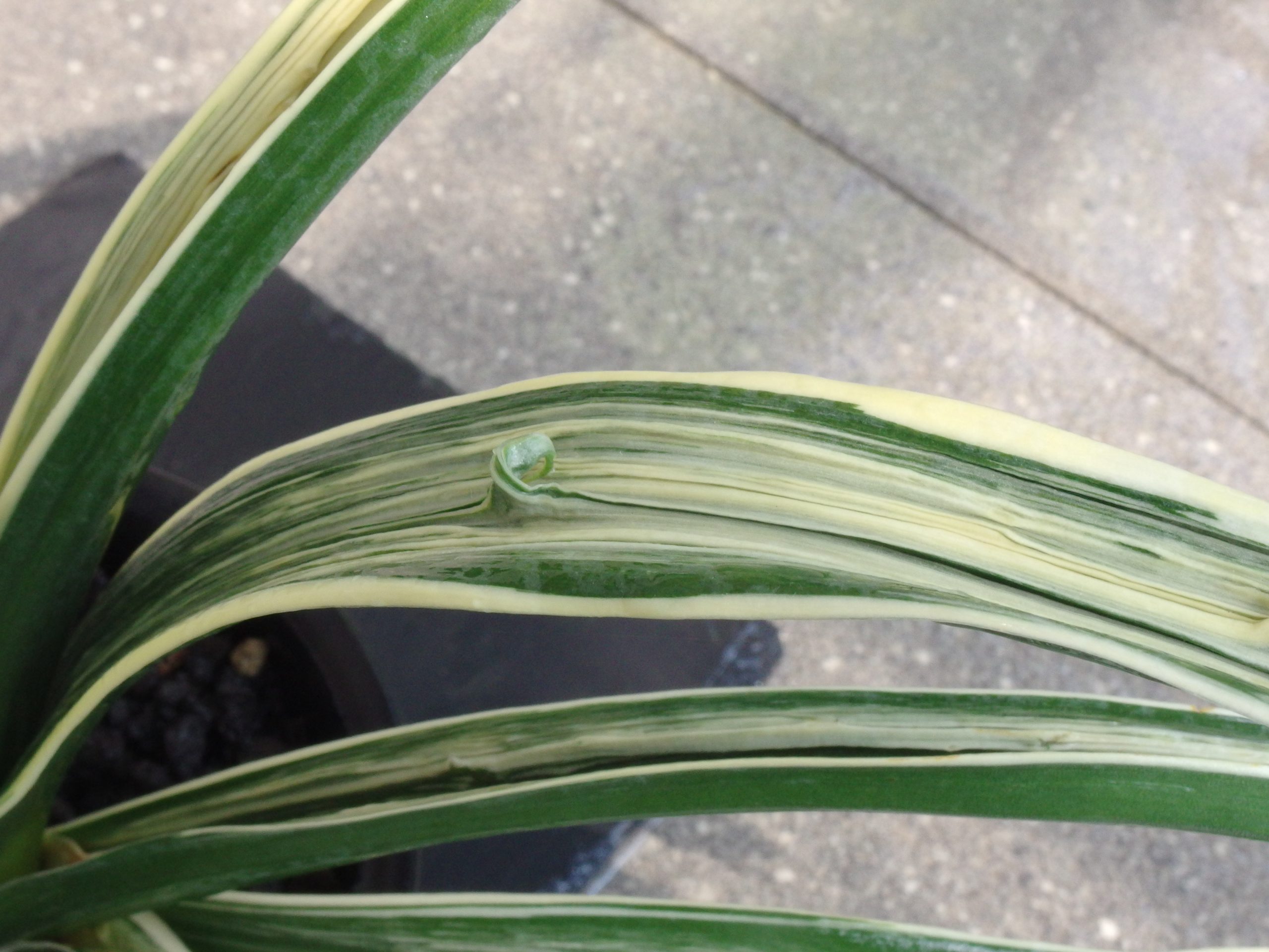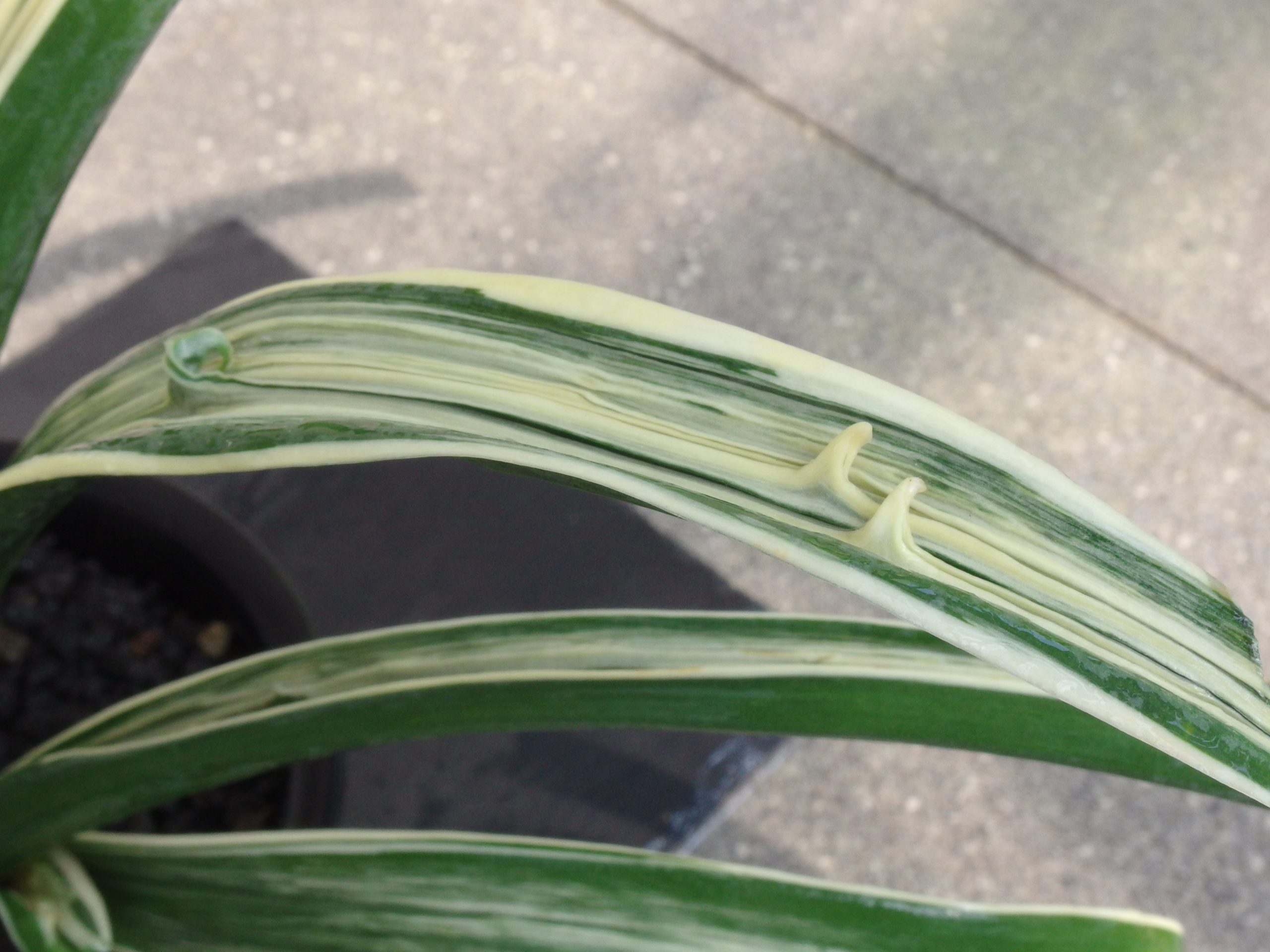 豊明海 (ほうめいかい) 鉢4.5号 縞甲系という雅糸龍を魅力的にみせる中型のおもと。その縞甲系の中でも葉幅は広く、迫力があります。濃紺の地質に雅糸竜を見せ小さな玉雅糸竜を見せます。この写真の木は、特に珍しい縞覆輪の木。濃紺の葉に覆輪のみの木ではどっしりとした力強さを、この稀少な縞覆輪では力強さの中に華やかさを感じさせる姿になります。『光陽』、『太陽』、『萬陽』など、小型、中型縞甲と呼ばれるものは人気品種が多いですが、この『豊明海』はその中でも横にどっしりと構えた姿で、この写真の縄縁太鼓胴のような胴太の鉢や、盆栽鉢、山草鉢など世界が横に広がっていく鉢との相性もよいです。メインに『豊明海』を据え、脇に可愛い山草を飾れば、渋さの中に愛らしさを感じさせる玄関飾りや床飾りに。今は一本立ちが主流の時代なので素立で楽しむことが多いですが、この『豊明海』や縞甲系は株立ちの迫力は抜群。株立ちの鉢植えにして育てると、普通の黒鉢に入っていても誰もがまず目を引く、焦点になるおもとです。首が太くなるので、非常に力強い印象を与えます。